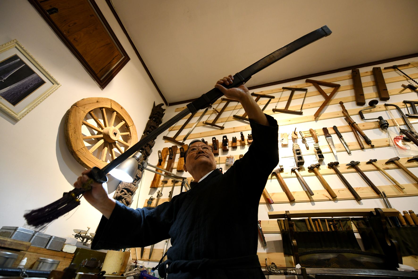 9月11日,在石家庄市新华区古兵器修复工作室内,闫民在展示修复好的古兵器。 石家庄市民闫民自幼酷爱兵刃刀剑,他已从事古兵器修复工作30余年。其子闫鹏受其影响,于2015年辞去原有工作,与父亲一起投入到古兵器修复中。如今父子两人累计修复古兵器500余件。 据闫民介绍,古兵器修复大体分为装具修复和刃体修复。在断定年代后,通过装具修复为古兵器配备相应年代的装饰和装具,再通过打磨、压光、研磨等工序对古兵器刃体进行修复。 闫民说,每一件古兵器都代表一段历史,修复古兵器也是再现历史,今后他们将与时间赛跑,为中国古兵器文化尽绵薄之力。新华社发(陈其保 摄)