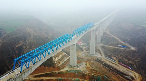 2月28日无人机拍摄的银西高铁漠谷河2号特大桥。 为确保银(川)西(安)高铁年底按期开通,2月28日,在做好疫情防控的同时,由西成铁路客运专线陕西有限责任公司建设、中国中铁四局集团有限公司承建的银西高铁漠谷河2号特大桥恢复施工。 银西高铁漠谷河2号特大桥位于陕西省咸阳市乾县境内,大桥全长1605.22米,是银西高铁全线跨度最大、墩高最高的桥梁,也是陕西段重点控制性工程。 新华社记者 刘潇 摄