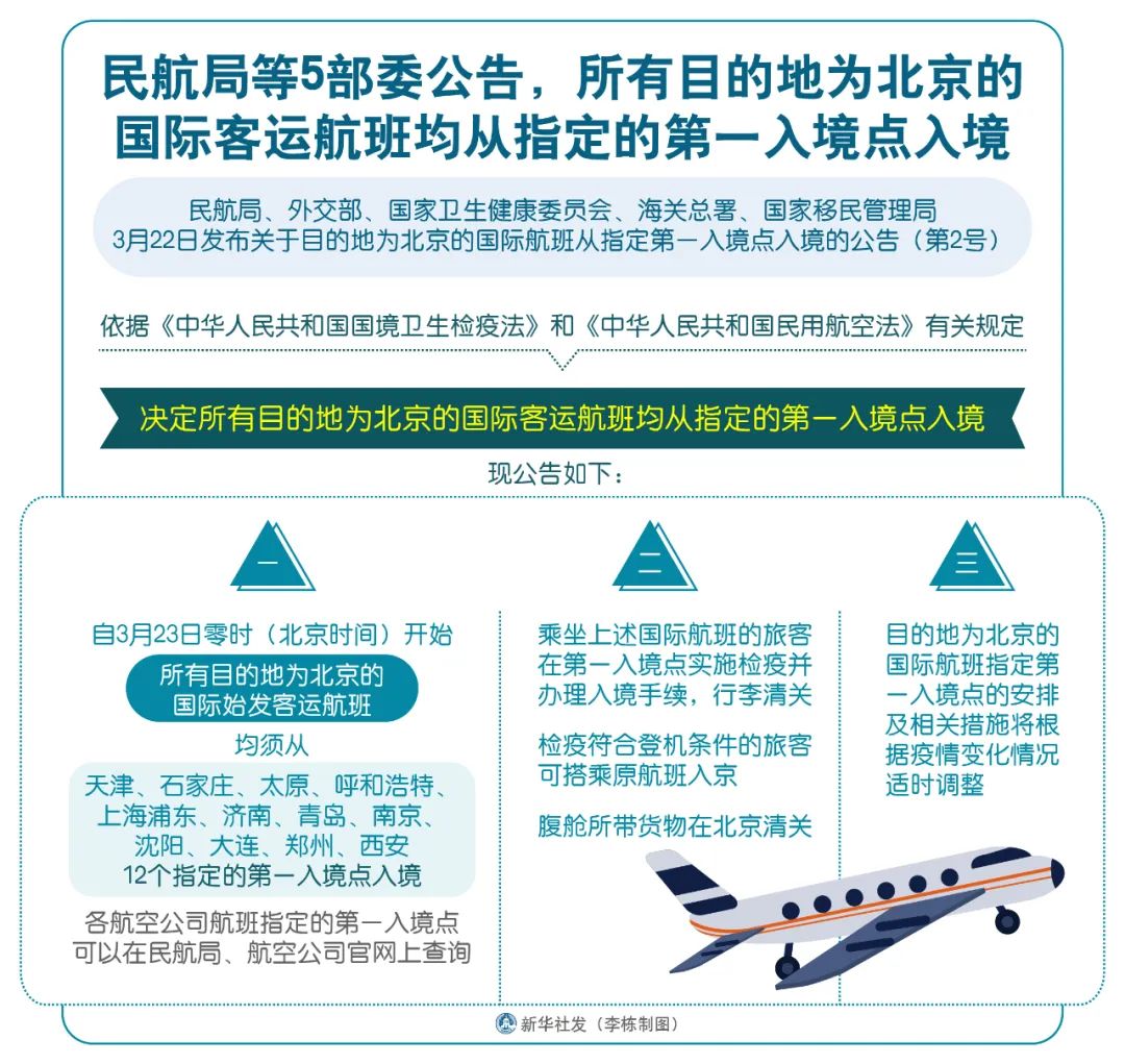 ◎民航局等5部委公告,所有目的地为北京的国际始发客运航班均须从天津、石家庄、太原等12个指定的第一入境点入境。