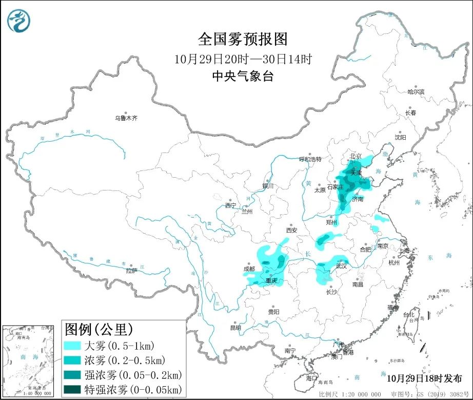 中央气象台预计,10月29日夜间至30日上午,北京东南部、天津、河北东部和中南部、山东西北部、河南北部和南部、江苏北部、湖北中部、湖南北部、四川盆地等地部分地区有大雾。其中天津西南部、河北东南部、山东西北部、四川盆地等地局部有能见度不足200米的强浓雾。上述地区民众谨慎慢行,注意交通安全。