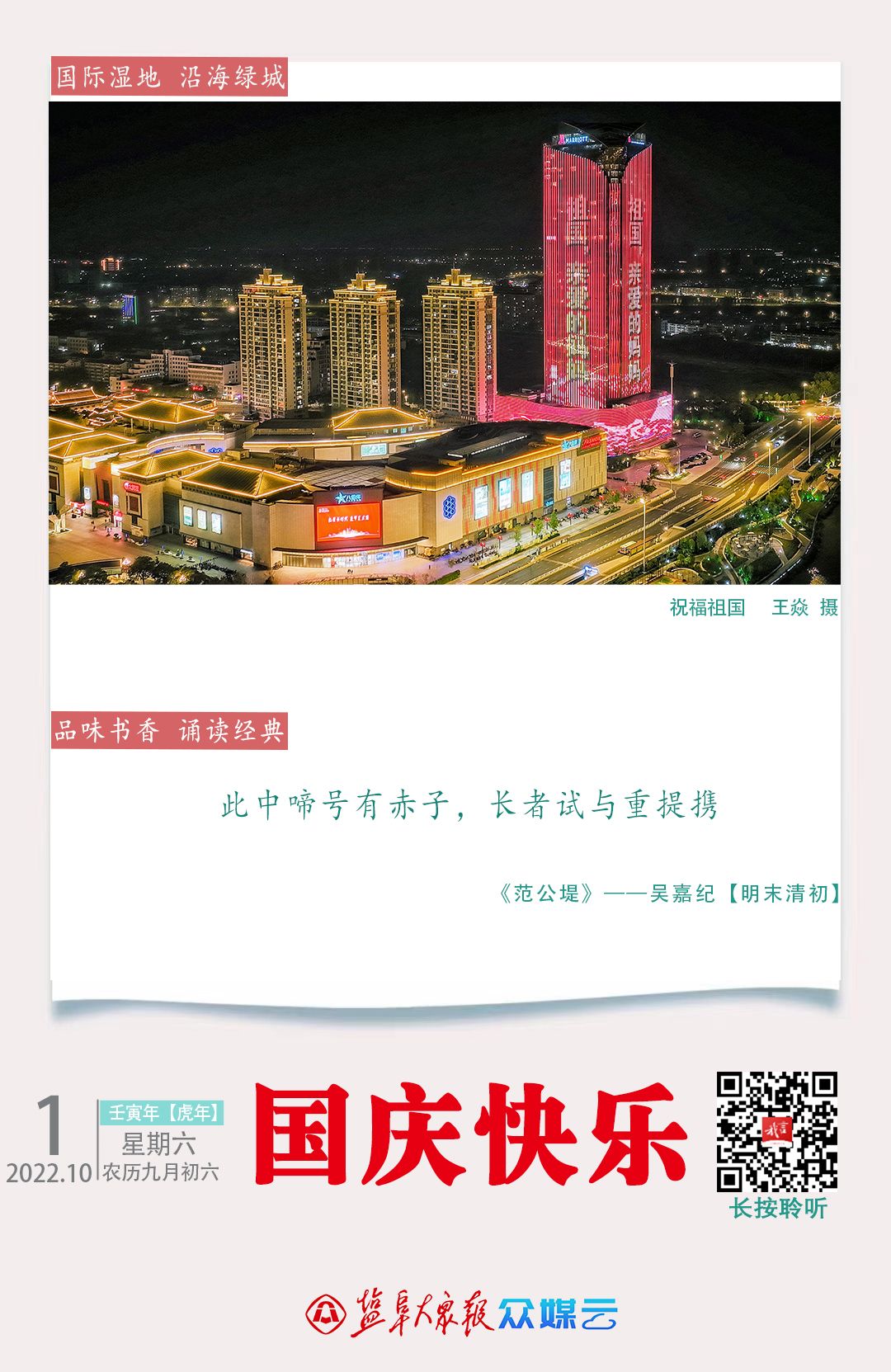读者朋友,早上好!今天是2022年10月1日,国庆节,壬寅年九月初六,星期六。今天多云,最高气温30℃。