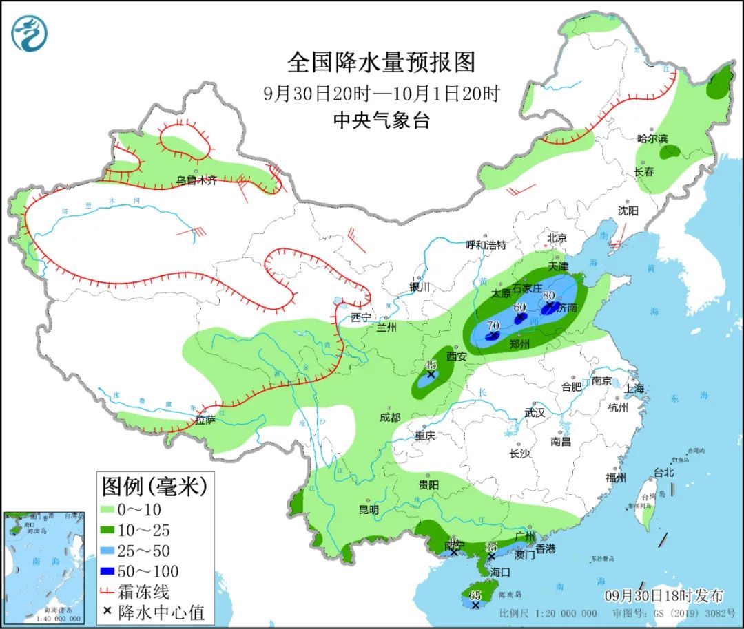 9月30日20时至10月1日20时,四川盆地北部、陕西南部、山西南部、河北南部、山东中西部、河南北部、广西南部、广东西南部、海南岛、云南西部和南部等地部分地区有中到大雨。