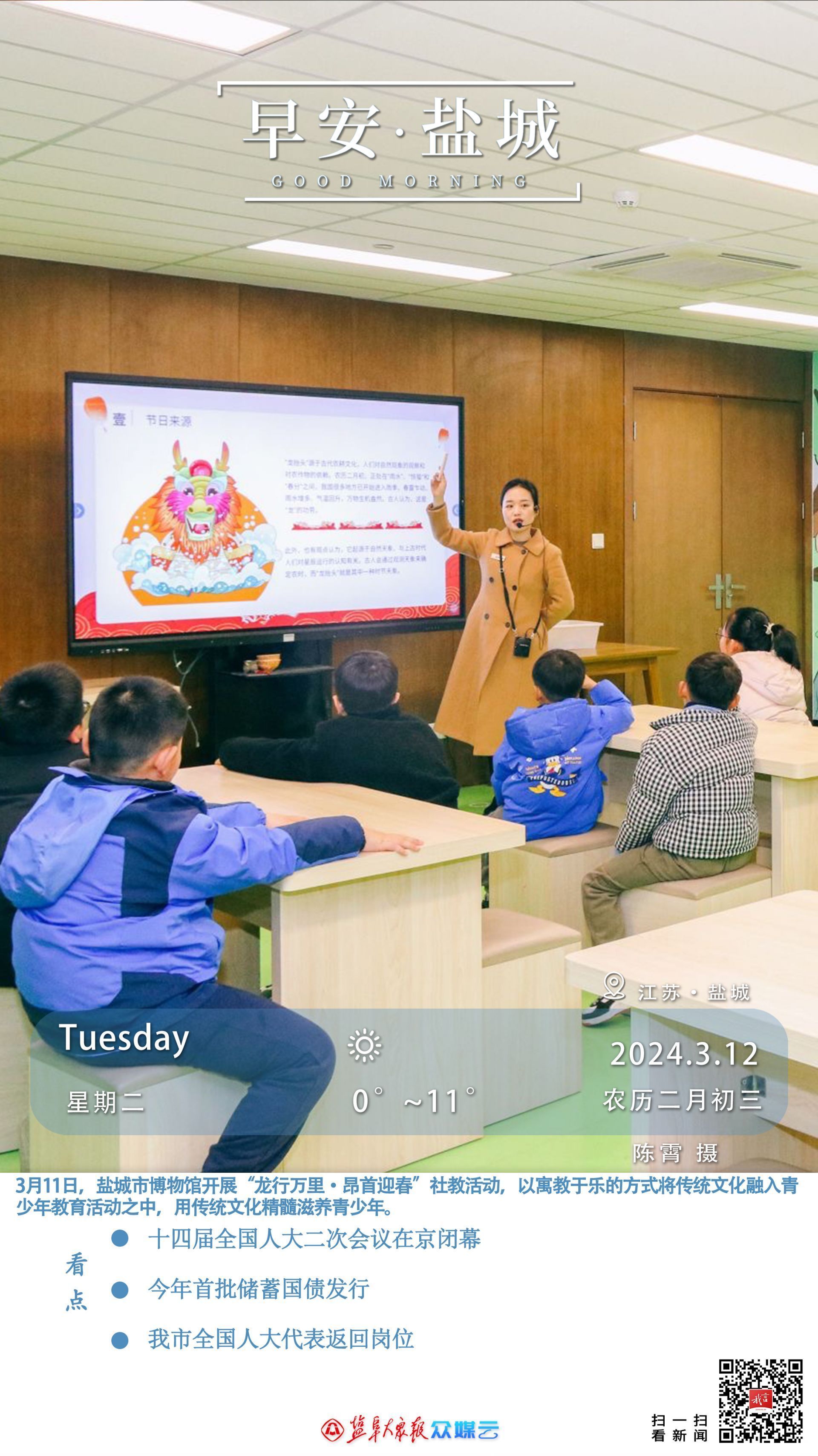 读者朋友,早上好!今天是2024年3月12日,星期二,甲辰年二月初三。今天多云到晴,偏北风5级阵风6到7级,夜里转偏南风3到4级。预计今天气温0至11℃。