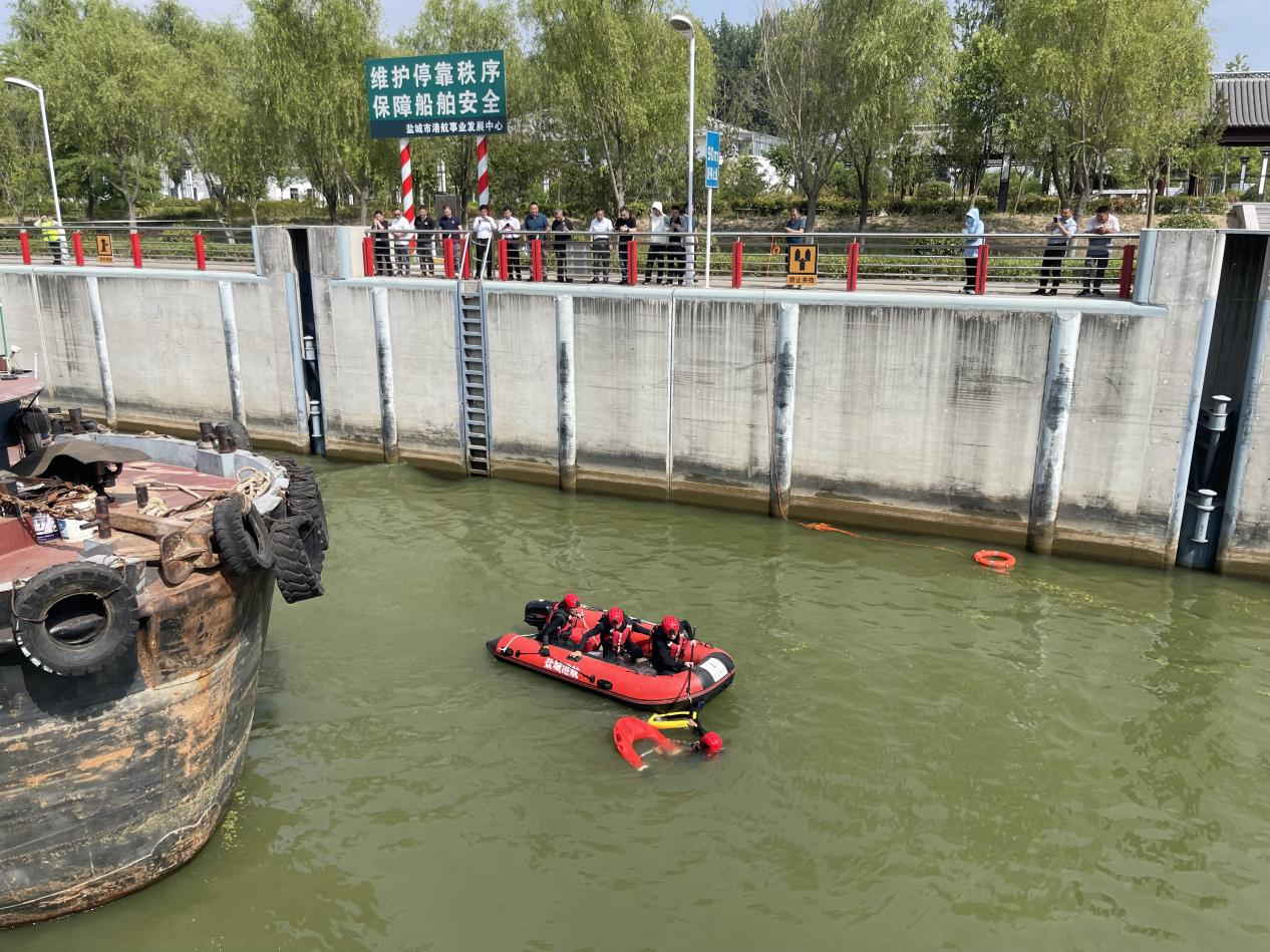 为充分贯彻落实省厅、市中心关于安全生产和应急处置救援工作的重要指示精神,进一步做好船闸安全生产工作,扎实推进“安全生产月”活动的开展,强化职工安全意识,提高全员应急响应能力,营造“人人讲安全、个个会应急”的良好氛围,盐城港航滨海船闸于6月14日下午开展“闸室人员意外落水救援”应急演练。滨海县港航事业发展中心、盐城运盐河船闸管理所、滨海县港顺船舶运输公司派员观摩演练。