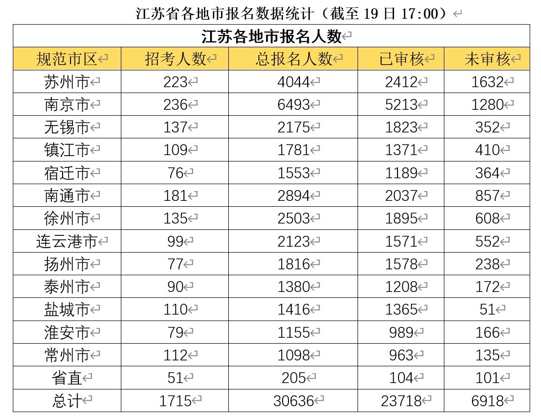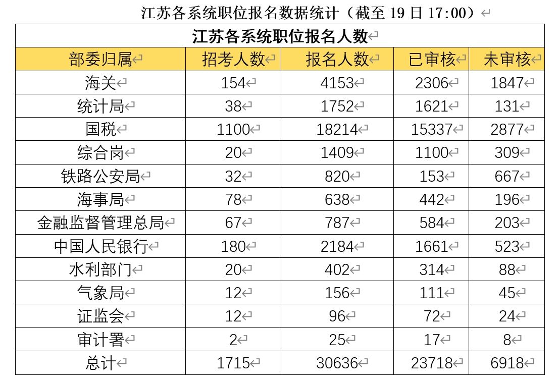 来看江苏。截至10月20日10:00,国考报名涉苏岗位的已有35172人,其中已有一般人已经通过资格审查,确认拿到2025国考“入场券”。从岗位热度来看,国税因为总体招录人数较多,报名人数依旧遥遥领先,截至19日17:00,总报名人数近1.8万,整体竞争比超过了16.5∶1。目前最热门岗位是国家统计局江苏调查总队的“江苏调查总队财务管理处一级科员”一职,竞争比达到763∶1。随着后面几天报名人数的增加,竞争强度必将进一步提高。目前还有16个职位无人提交报名申请,占总职位数的4.5%,这些岗位大多集中在海事系统,这与报考条件限制较多有关。