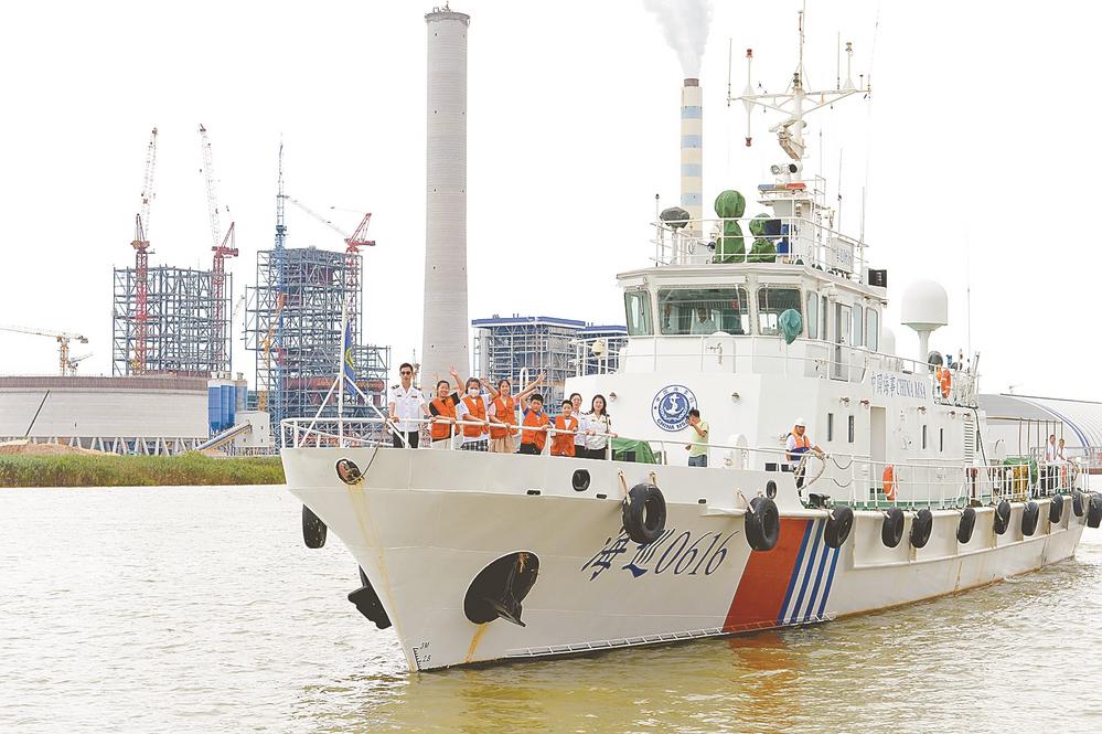 在海巡艇甲板上,盐城海事局指挥中心通航管理处的盛元东,深入浅出地向小记者讲解航海发展史和基础知识,用现场演示、你问我答等形式,讲解救生衣的使用方法及海上逃生注意事项,传授海上求生急救技能。还在甲板上现场发射船用橙色烟雾信号弹,让小记者们在耳濡目染中初步懂得如何进行自我防护,危险中如何求救,明白水上交通安全意识的重要性。