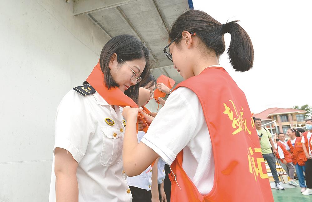 本报讯 为进一步普及中小学生水上交通安全知识,提高水上求生技能,提升海事影响力,营造全社会共同关注学生水上交通安全的良好氛围,推动水上交通安全知识教育和技能培养从室内走向室外,从岸上走向水上,使水上交通安全知识进校园、进家庭、辐射社区、带动社会,8月25日,盐城海事局组织开展了“点燃梦想 逐梦未来”海事开放日暨水上交通安全知识拓展夏令营活动。当天上午,30多名盐城晚报小记者来到射阳趸船基地。