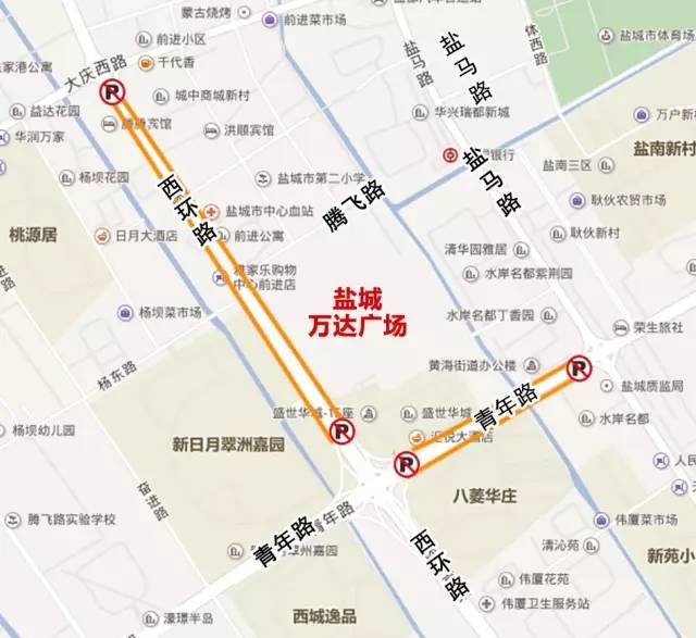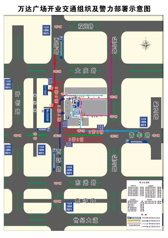 市民驾车出行可从西环路、盐马路、青年路可进入万达区域,进入后可选择西环路西侧停车场、万达广场地下停车场、万达广场东侧停车场停放,如上述停车场停满后,市民车辆可在西环路(青年路以南)西侧、西环路(大庆路以北)东侧、青年路(西环路以西)北侧、青年路(盐马路以东)南侧机动车、非机动车道就近进行停放。停放原则为: