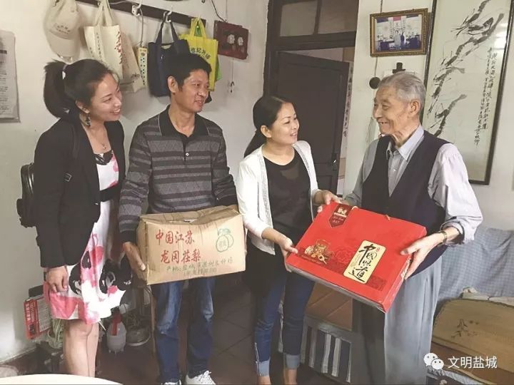 昨天上午,亭湖区文峰街道大庆社区开展“迎国庆、庆中秋”主题活动,社区工作人员来到辖区内的空巢老人唐晓曙(右)家中,送去了节日的礼物。老人已九旬高龄,平时一人在家,社区工作人员经常上门探望,给老人温暖关心。