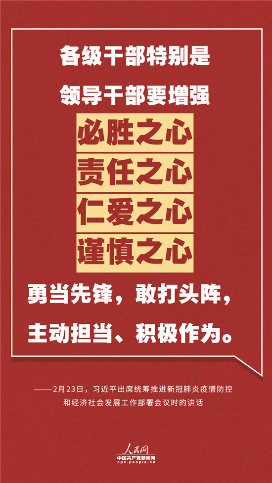 基层是联防联控、群防群治的第一线。“习近平总书记强调,各级干部特别是领导干部要增强必胜之心、责任之心、仁爱之心、谨慎之心,勇当先锋,敢打头阵,主动担当、积极作为。作为基层党员干部,我们要继续坚守在一线,战斗在一线,通过开展‘学习型家庭’线上知识竞赛、在线心理辅导、‘菜篮子’服务送上门等活动,带领群众打好、打赢这场疫情防控阻击战。”盐南高新区南港社区党委书记李正鑫在战“疫”一线说。