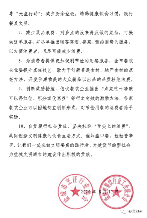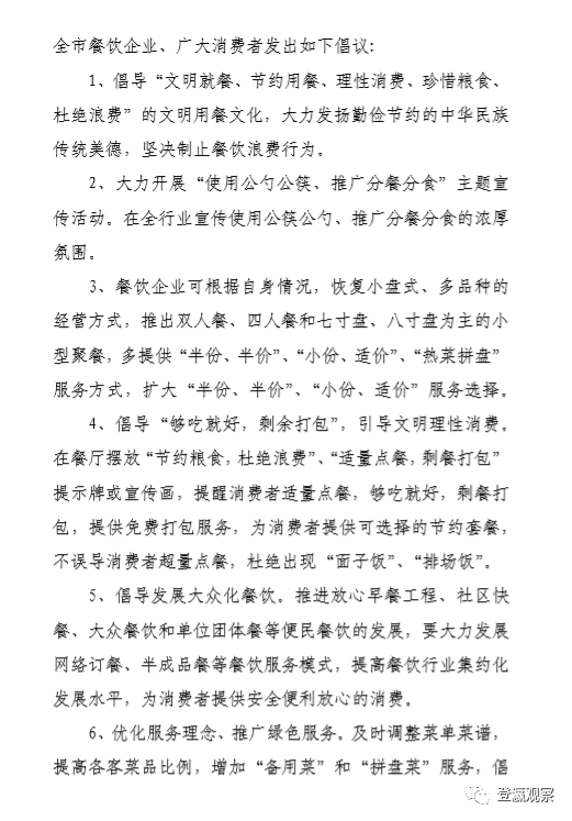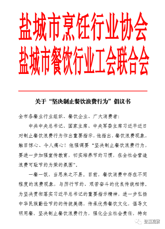 近日,习近平总书记对制止餐饮浪费行为作出重要指示。他指出,餐饮浪费现象,触目惊心、令人痛心!8月11日,市烹饪行业协会和市餐饮行业工会联合会联合发布倡议书,倡导“文明就餐、节约用餐、理性消费、珍惜粮食、杜绝浪费”的文明用餐文化,大力发扬勤俭节约的中华民族传统美德,坚决制止餐饮浪费行为。
