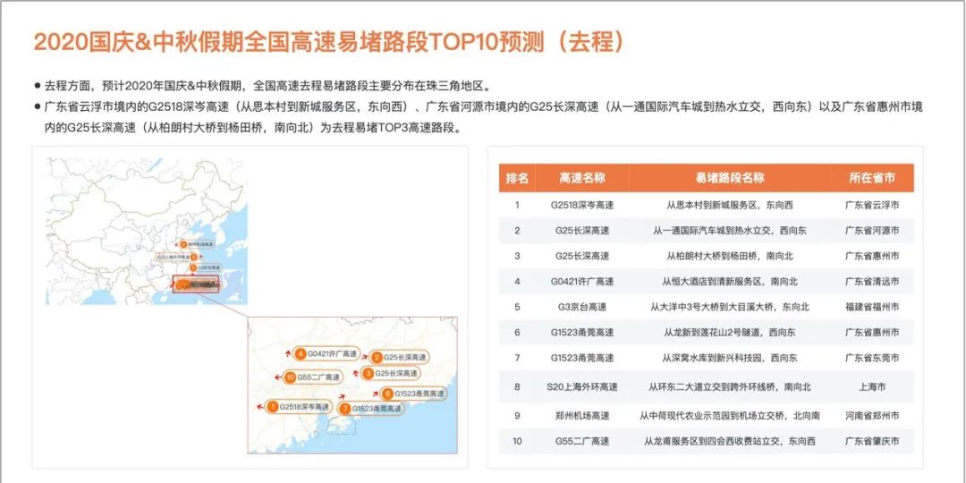 根据百度及交通运输部科学研究院发布的数据显示,受疫情影响,自由度更高、安全性更好的自驾出行备受青睐,预计10月1号,将是出行最高峰,而返程小高峰预计将于10月5号出现。要提醒大家的是,假期8天中全国高速车流量都将维持在高位,易堵路段聚集长三角、珠三角地区。