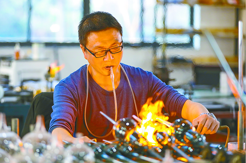 近日,盐城市建湖县恒济镇建河村玻璃工坊内一片繁忙,工人骆步猛戴着护镜,在自己的工作台位上迎着热浪、叼着吹气管,“派头十足”地加工玻璃茶壶。不一会,玻璃原料经过他的一双巧手,被制成一件精美的工艺品。“关键是控制火候,这个要1000摄氏度左右,否则加工出来的就是瑕疵品。”说完,他用毛巾使劲擦拭脸上的汗水。