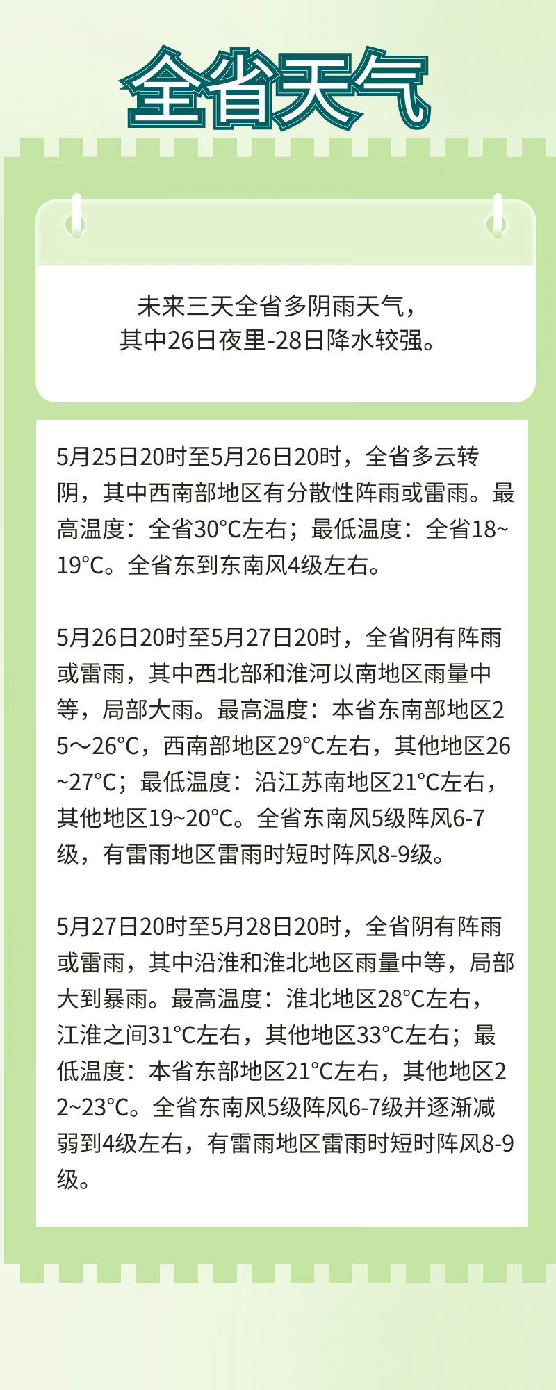 5月26日20时至5月27日20时,全省阴有阵雨或雷雨,其中西北部和淮河以南地区雨量中等,局部大雨。最高温度:本省东南部地区25~26℃,西南部地区29℃左右,其他地区26~27℃;最低温度:沿江苏南地区21℃左右,其他地区19~20℃。全省东南风5级阵风6-7级,有雷雨地区雷雨时短时阵风8-9级。