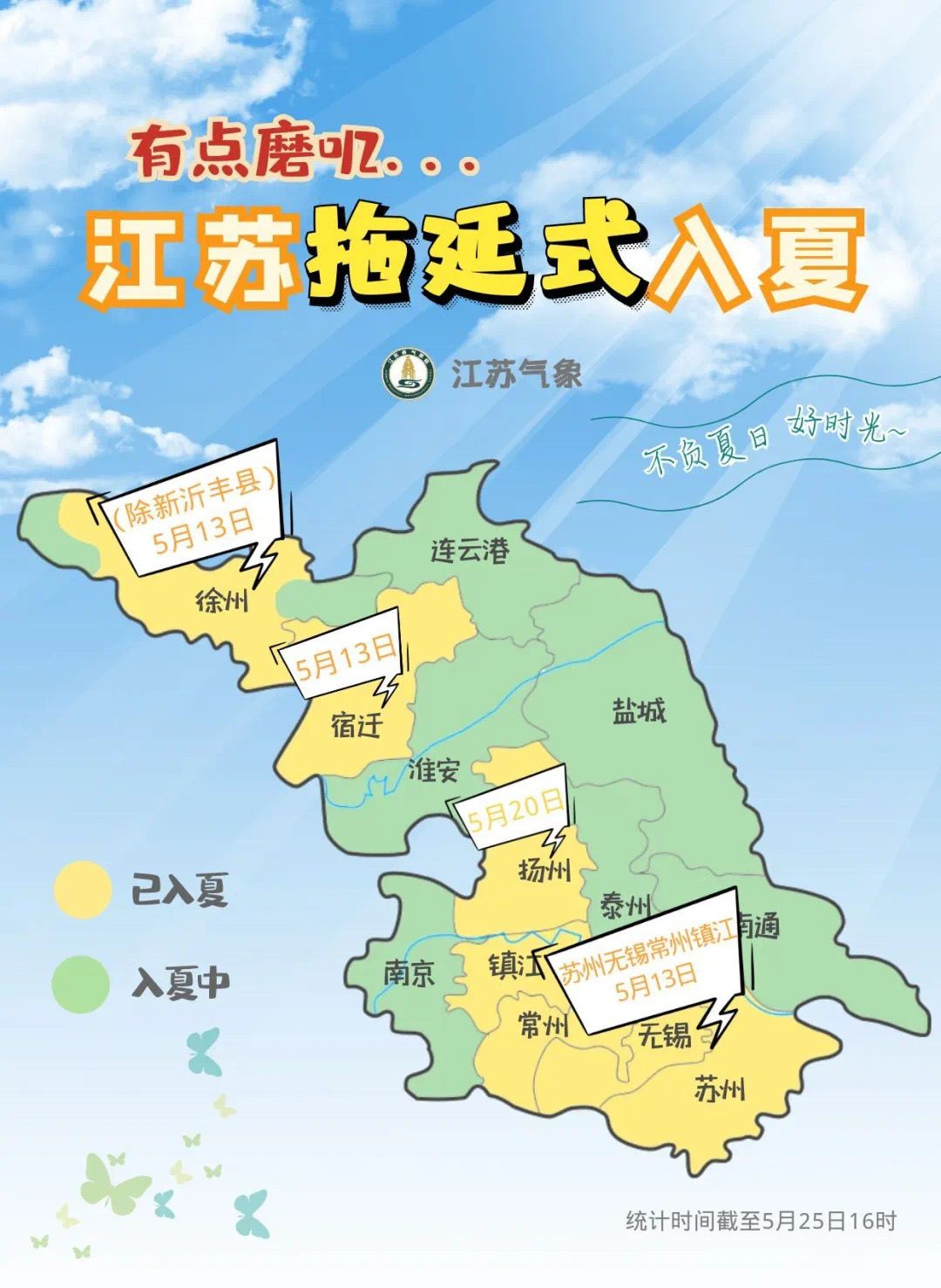 交汇点讯 夏天夏天磨磨唧唧没有小秘密,截至5月25日16时,江苏已经有7市官宣入夏,其它地区入夏中,静待官宣。