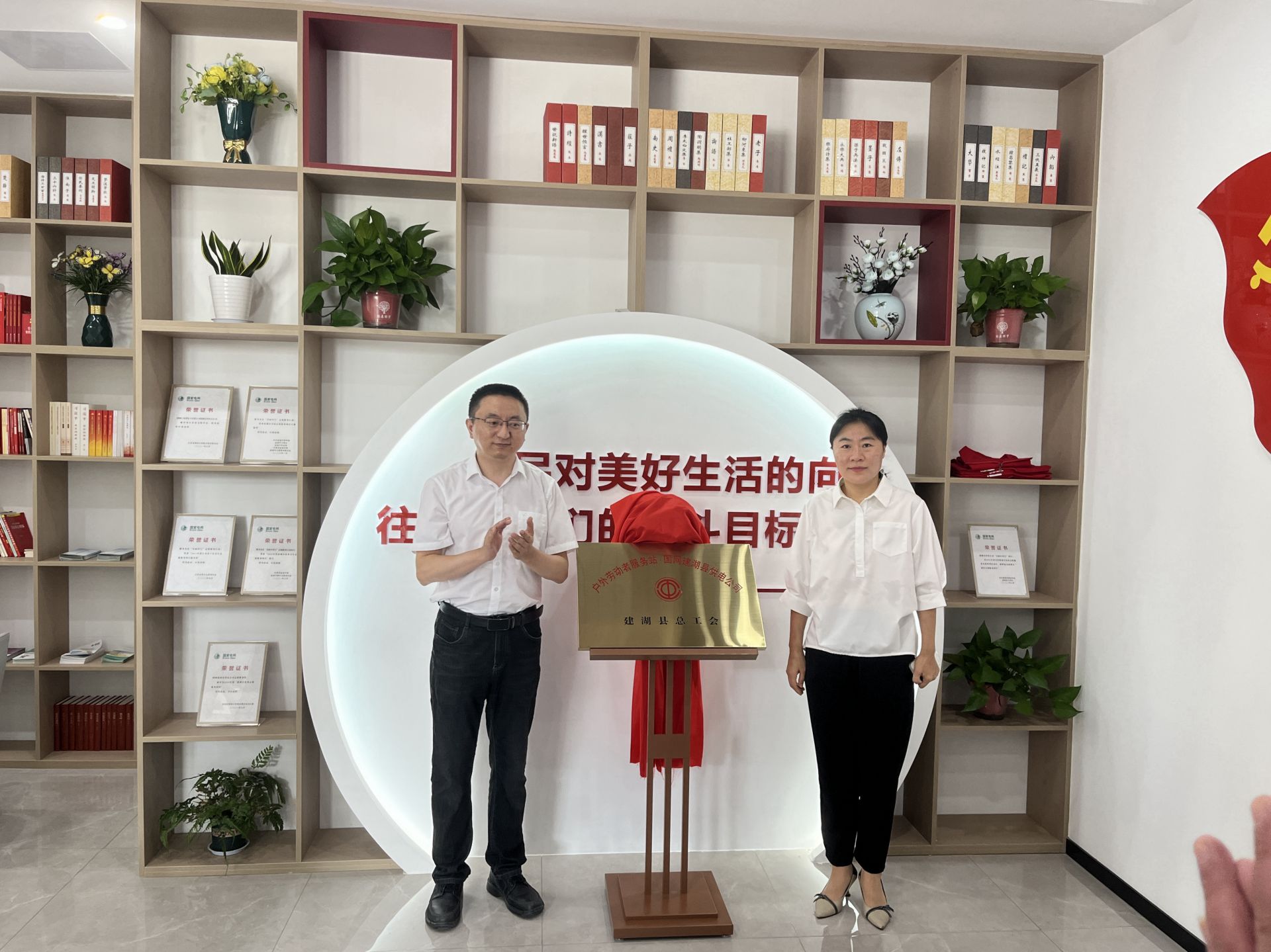 8月4日上午,由建湖县总工会联合国网江苏省电力有限公司建湖县供电分公司共同打造的工会户外劳动者服务站点正式揭牌投入使用。建湖县总工会副主席陈玲玲、国网建湖县供电公司工会主席兼纪委书记张帆共同为站点揭牌,并为户外劳动者群体发放清凉物资。