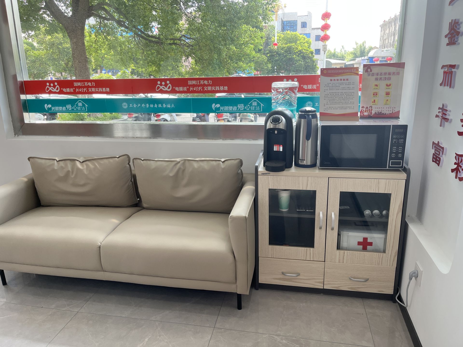 国网建湖县供电公司户外劳动者服务站点配备了微波炉、饮水机、工具箱、雨伞、应急医药箱、冰箱等设施,设置党建展览板、报刊书籍架等,为长期从事户外劳动的一线职工,尤其是环卫工人、执勤交警、快递员、送餐员等户外劳动者解决他们在户外工作中存在的“吃饭难、喝水难、休息难”等问题,让他们真正感受到来自党委、政府和工会组织的关怀。