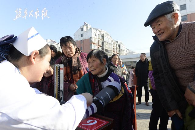 1月16日,2019年江苏省、盐城市文化科技卫生“三下乡”集中服务活动在阜宁县吴滩街道举行。上午9:30,阜宁县吴滩街道吴滩居委会新时代文明实践广场上人头攒动,十分热闹。严冬的寒冷并没有阻挡当地老百姓的热情,他们从四面八方赶来,感受活动带来的实惠和温暖。省、市31个服务团队现场接受咨询,解答疑惑,为老百姓送上实惠大礼包:科技、司法部门的工作人员开展实用技术、法律知识的培训指导;卫生部门的工作人员为群众提供咨询、义诊服务;文化、教育部门的工作人员为群众写春联、送福字、赠图书、现场演出。其他相关职能部门也开展了形式多样的现场咨询服务活动。图为卫生部门的工作人员为群众提供咨询、义诊服务。 记者 祁佳 文 周晨阳 摄