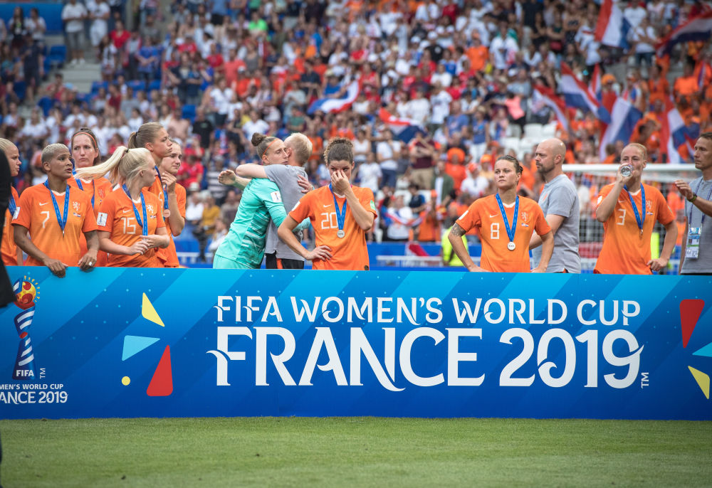 2019年7月7日,荷兰队球员在颁奖仪式上。当日,在法国里昂举行的2019年国际足联女足世界杯决赛中,荷兰队以0比2不敌美国队,获得亚军。新华社记者肖艺九摄