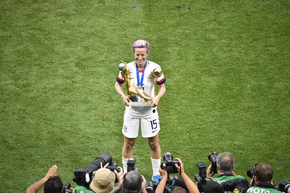 2019年7月7日,2019女足世界杯决赛后,获得金靴奖、金球奖的美国队球员拉皮诺在颁奖仪式后展示奖杯。新华社记者陈益宸摄