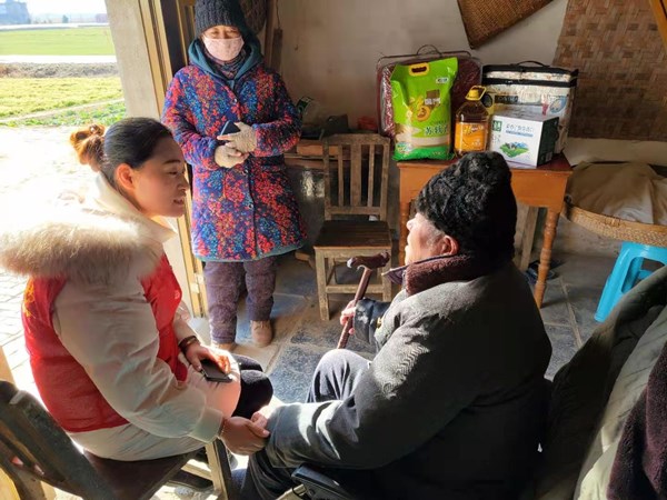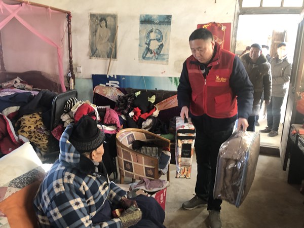 困难群众李元信是一名疾病康复者,双手患疾病时落下残疾,为了生活曾两次生火做饭被烧伤,他的冷暖一直被志愿者们惦挂,志愿者们为他送上了大米、油、被子、牛奶等生活用品和抗寒物资,并与他拉家常,叮嘱他平时要多注意身体,生活上有什么困难红色驿站会尽力帮助他们。李元信感谢志愿者们对他的关怀,激动地连声说:“真的太谢谢你们了!”