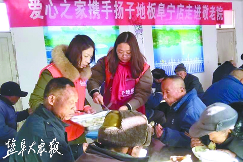 12月17日,阜宁爱心之家的志愿者们携手扬子地板的工作人员一起,走进新沟敬老院,看望敬老院里的26位老人。志愿者给老人们打扫卫生、理发,还现场与老人们一起包水饺。吃着热腾腾的饺子,老人们喜笑颜开。