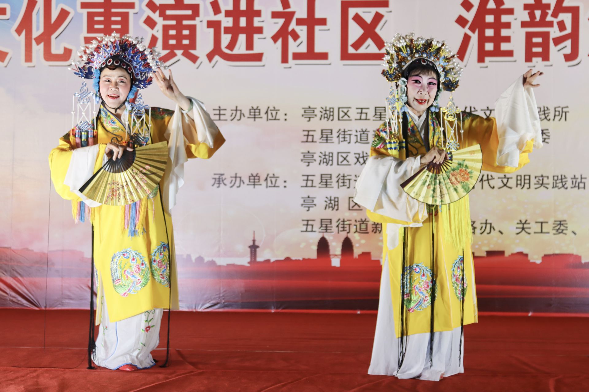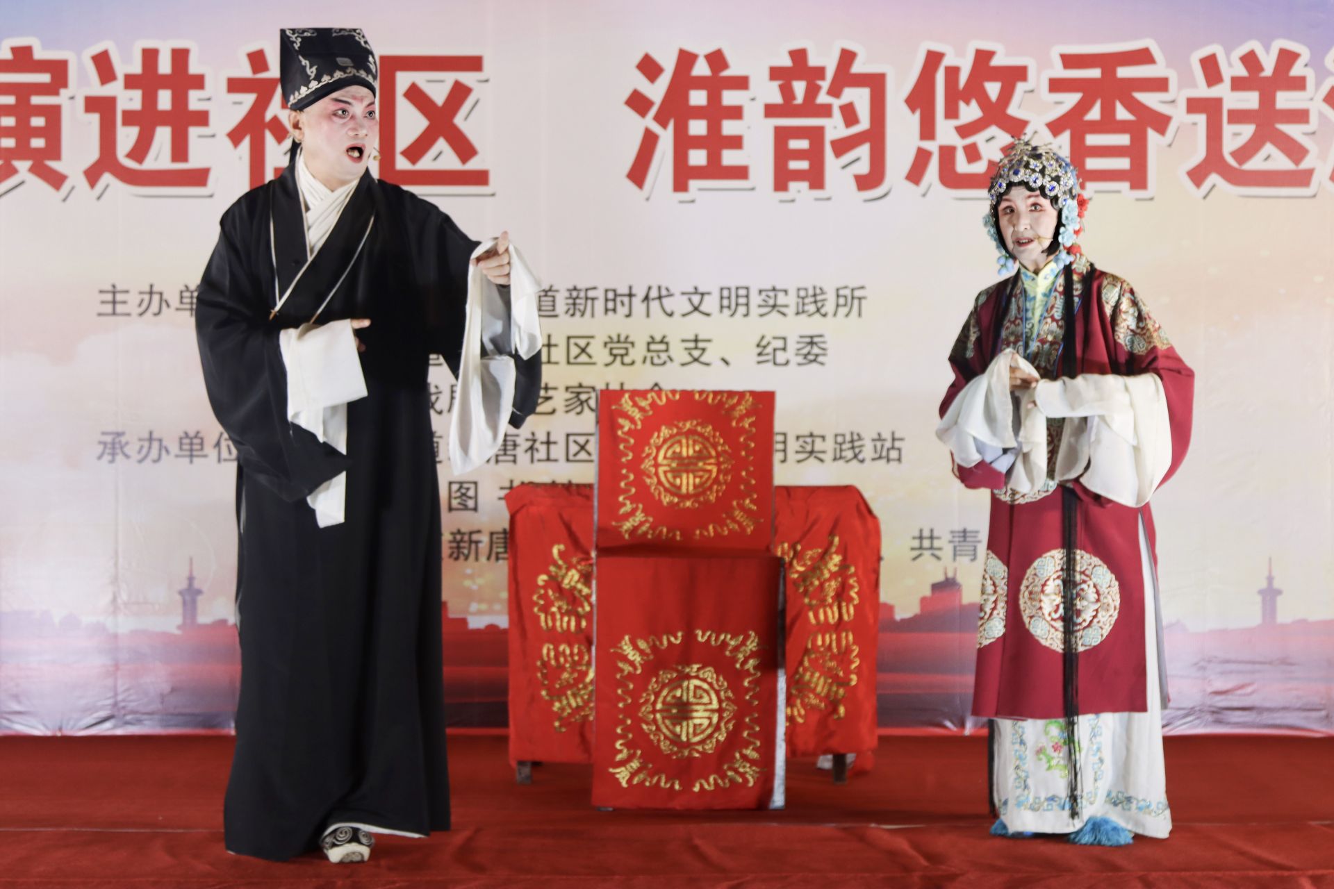 亭湖区戏剧曲艺家协会艺术家们表演了精彩的戏剧、曲艺节目,亭湖区戏剧曲艺家协会顾问、国家一级演员吕辅国、王花兰表演精彩的小淮剧《戒赌》。亭湖区戏剧曲艺家协会副主席、淮剧传播人、东闸新村社区党委书记武山和王花兰带来了古装淮剧珍珠塔选段《见姑》一折。现场气氛热烈,笑声不断。