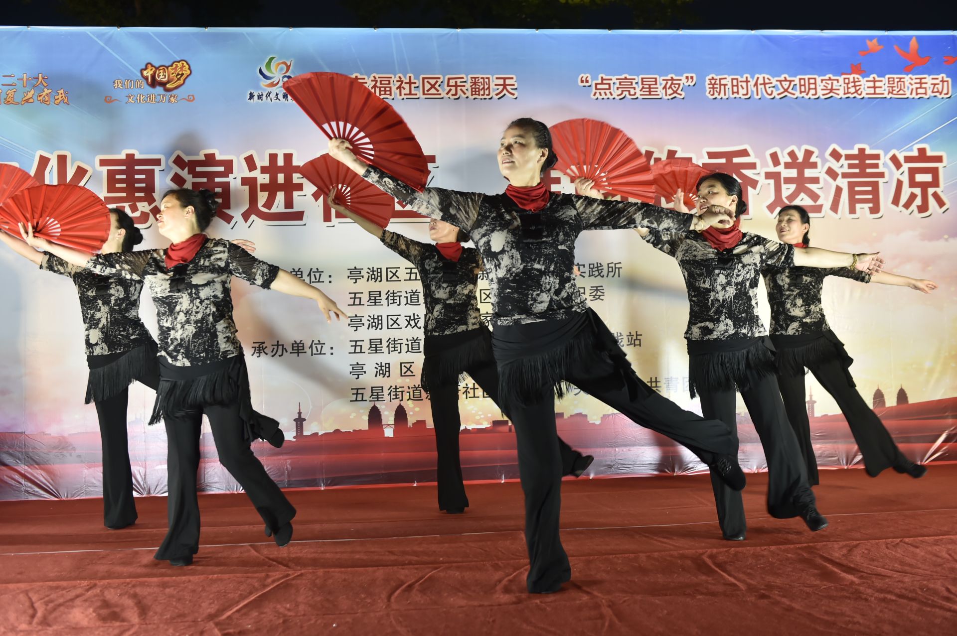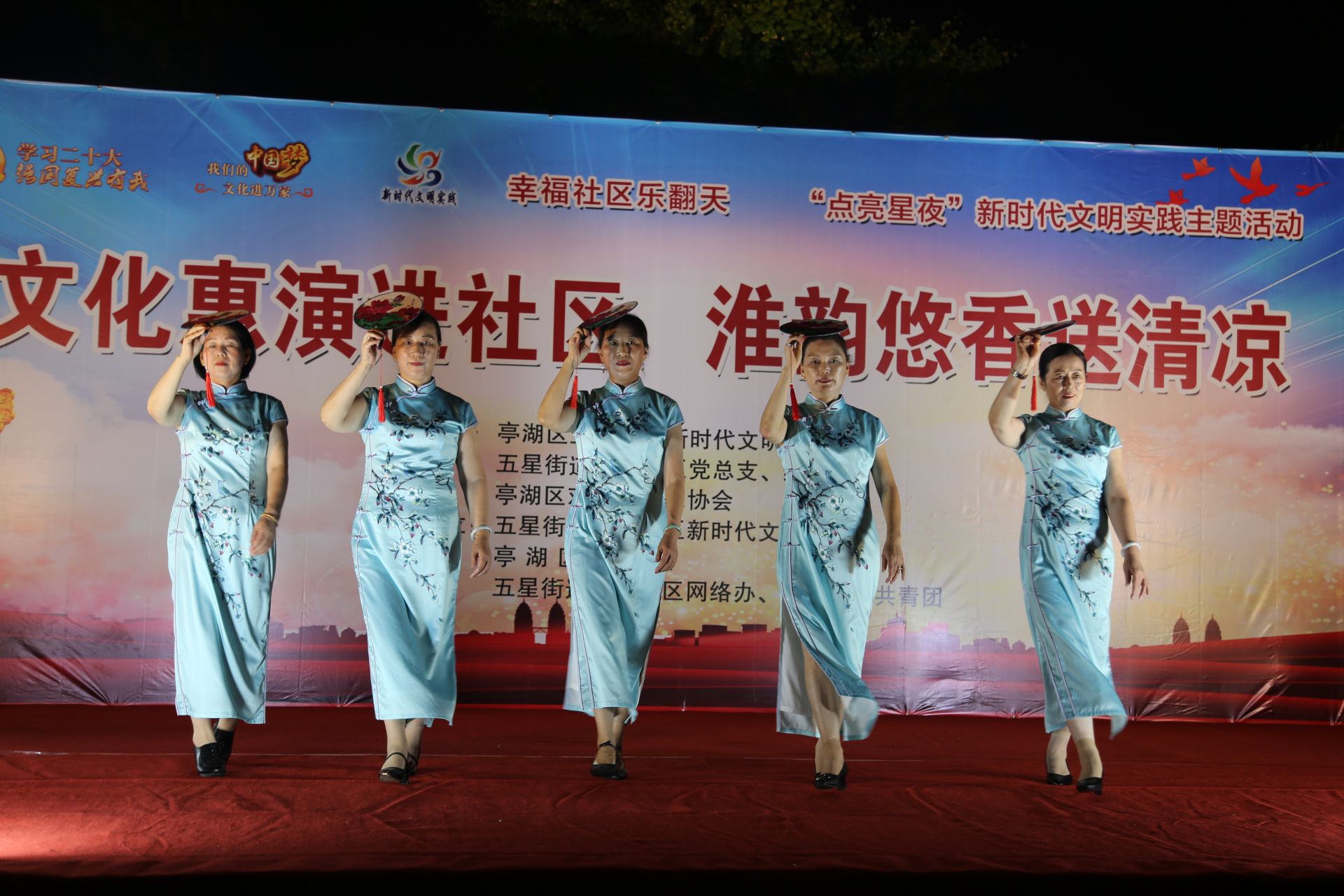 演出节目形式丰富多彩,有舞蹈、朗诵、淮剧、昆曲。首先由新唐社区艺术团带来舞蹈《中国梦》。接着,盐城市锦绣芙蓉艺术团表演了美轮美奂的旗袍秀《江南雨》,新时代江苏好少年、亭湖区图书馆“书·有香”志愿服务队阅读推广者徐钰淇表演朗诵《党旗颂》,五星街道清风艺术团表演了幽默风趣的锣鼓说唱《抢支书》和小品《送礼》等,赢得观众阵阵掌声。