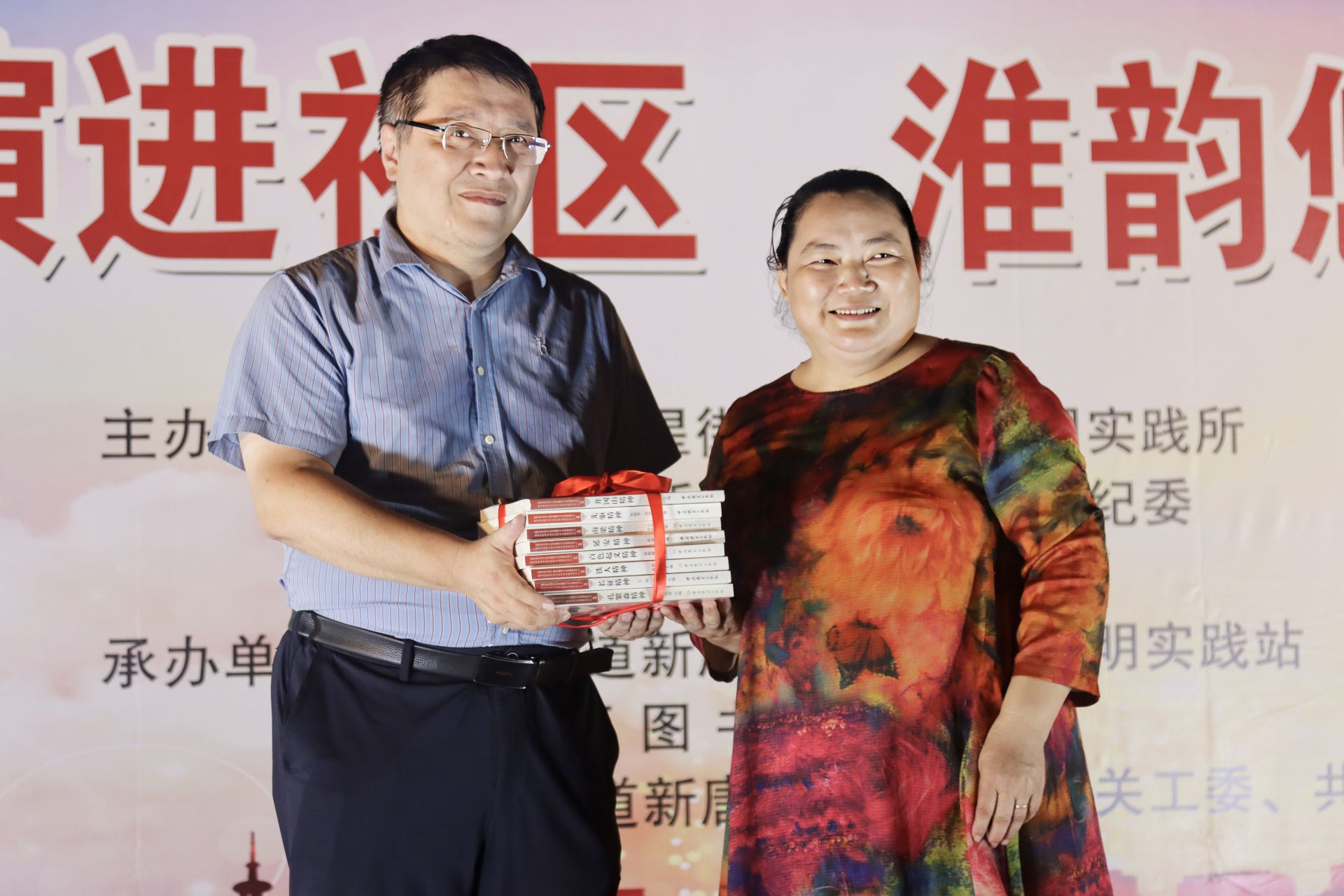活动开始前,亭湖区图书馆馆长朱晓梅向新唐社区党总支书记黄晓斌赠送了《祝您健康》杂志和《中国共产党革命精神系列》图书共120册,区图书馆工作人员组织现场的新唐社区居民观看了《国家功勋》展览。
