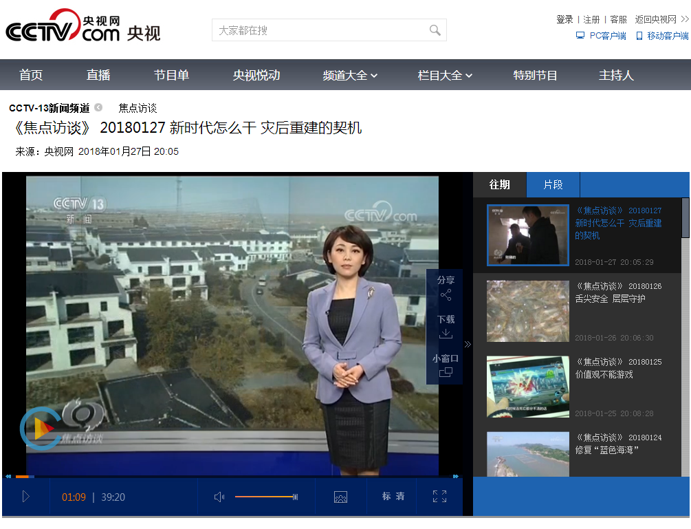 2018年1月27日晚,央视《焦点访谈》 播出《新时代怎么干 灾后重建的契机》,聚焦我市阜宁康居工程建设,以一个个生动鲜活的故事向全国介绍了乡村振兴的盐城经验。