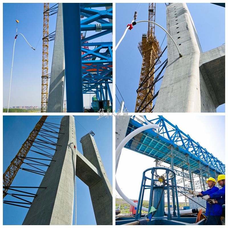 徐盐铁路跨新洋港大桥位于亭湖区新洋港与通榆河汇流处,东临通榆河,西临既有的新长铁路。“这座大桥是盐徐高铁引入盐城站的重点控制性工程,共有96根斜拉索,总重量818吨,两个主塔上各有48根斜拉索。”中铁四局徐盐铁路钢构分部工程部长李坤介绍,大桥双塔双索呈扇形布置。最长的一根斜拉索为12号索,长163米、重11吨。而当天挂设的1#索是96根斜拉索里面施工工序的第一根。