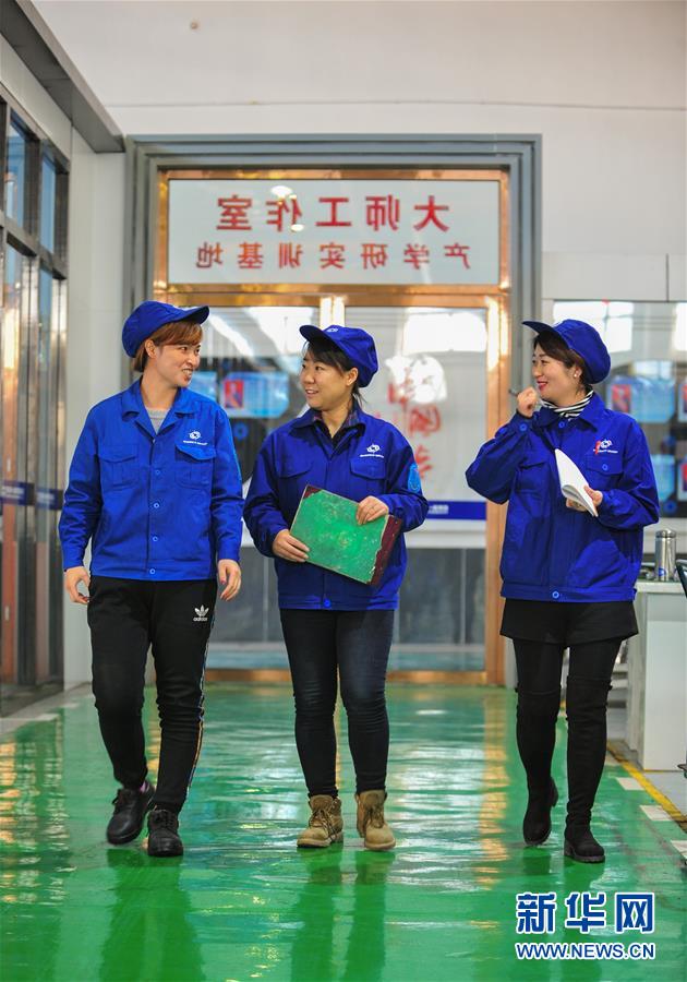 赵晶(中)在内蒙古第一机械集团有限公司的大师工作室内与工友进行技术交流(3月5日摄)。