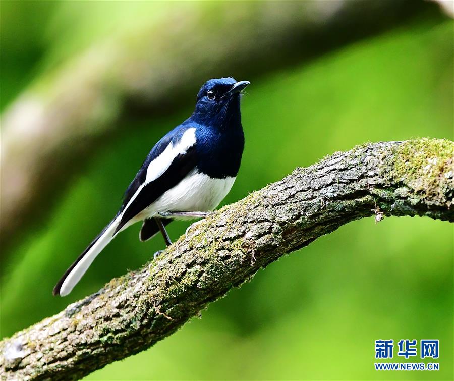 一只鹊鸲在福州西湖公园的重阳木树上停歇(3月18日摄)。福州西湖公园墨池的湖心小岛上,有4棵年岁久远的重阳木树。初春时节,鸟儿在苔藓遍布的树枝嬉戏、停歇,引得市民驻足流连。 新华社记者梅永存 摄