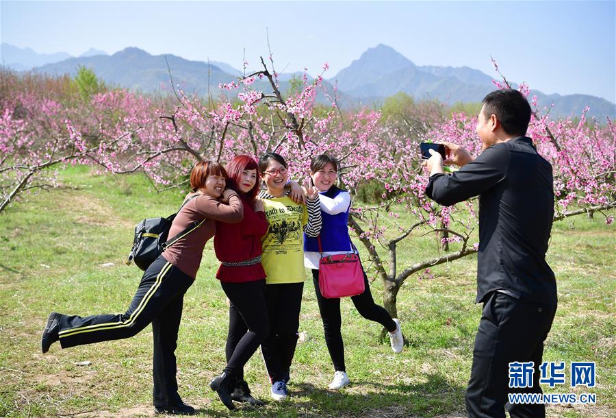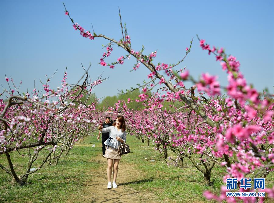 3月28日,游客在长安区王莽街道江柳村的桃花林中拍照。