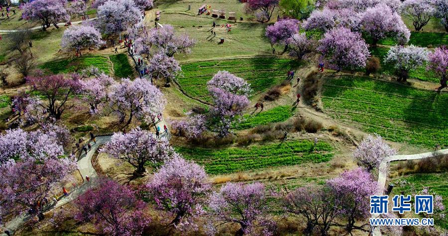 鸟瞰西藏林芝市巴宜区嘎拉桃花源景区(3月27日无人机摄)。近日,有“西藏江南”之称的林芝市的野生桃花绽放,美不胜收,吸引了众多游人踏青赏花。 新华社记者 张汝锋 摄