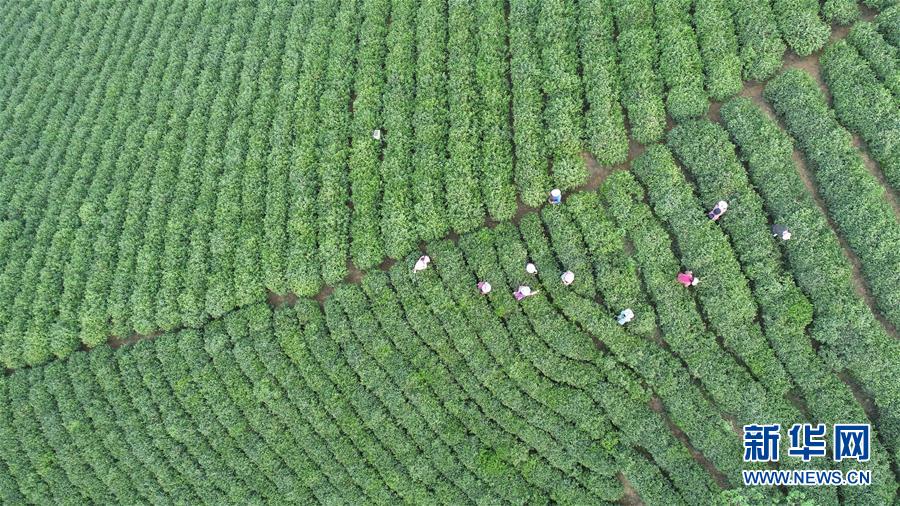 4月17日,茶农在河南省信阳市浉河区茶山采茶(无人机航拍照片)。 新华社记者 冯大鹏 摄