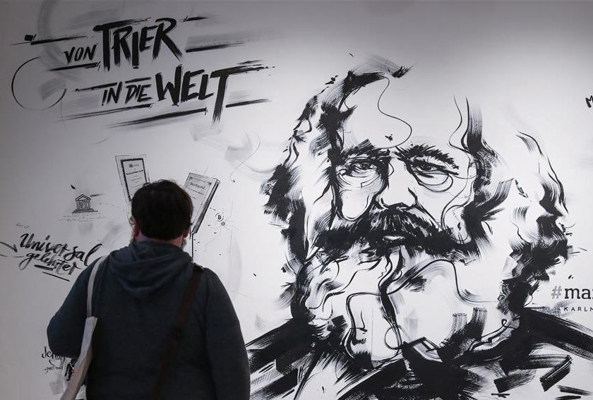 5月3日,在德国特里尔马克思故居纪念馆内,一名参观者站在一面绘有马克思画像的墙壁前。新华社记者 单宇琦 摄