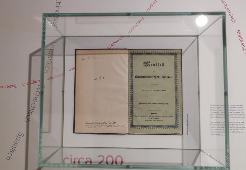 这是5月3日在德国特里尔马克思故居纪念馆内拍摄的1848年出版的《共产党宣言》第一版。新华社记者 单宇琦 摄