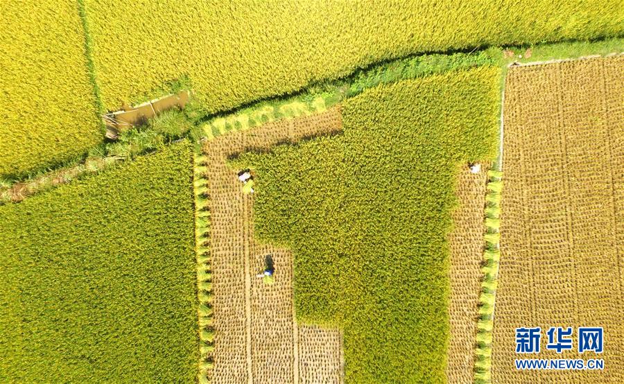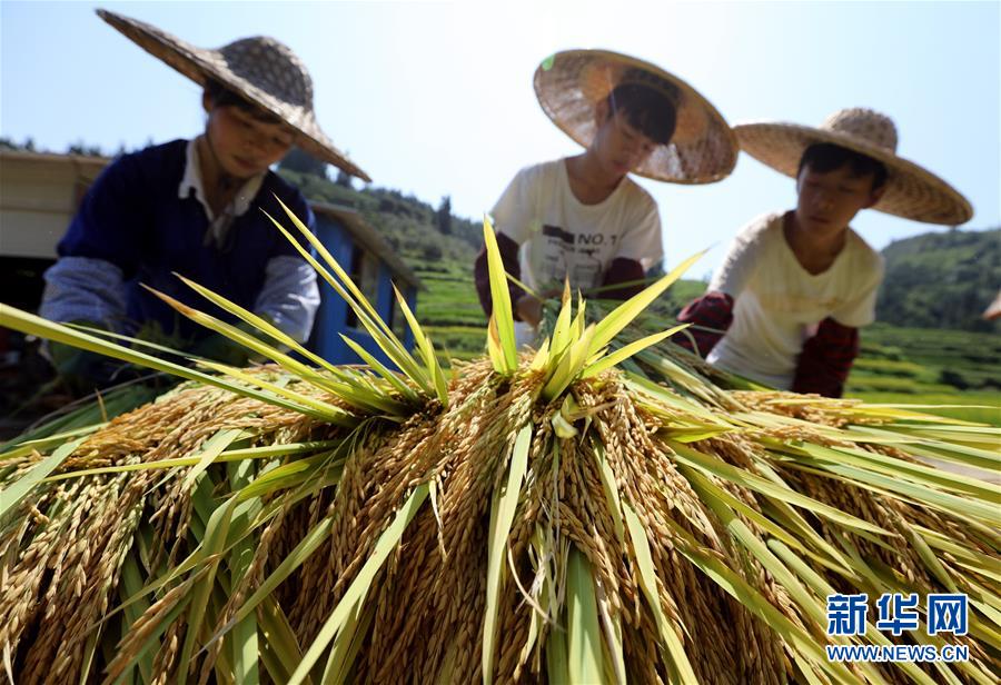 8月9日,在广西三江侗族自治县八江镇平善村,农民在田间收割稻谷。 新华社发(吴练勋 摄)