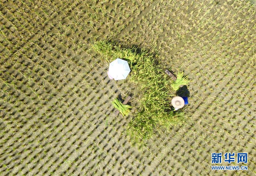 8月9日,在广西三江侗族自治县八江镇平善村,农民在烈日下抢收早稻(无人机拍摄)。 新华社发(吴练勋 摄)