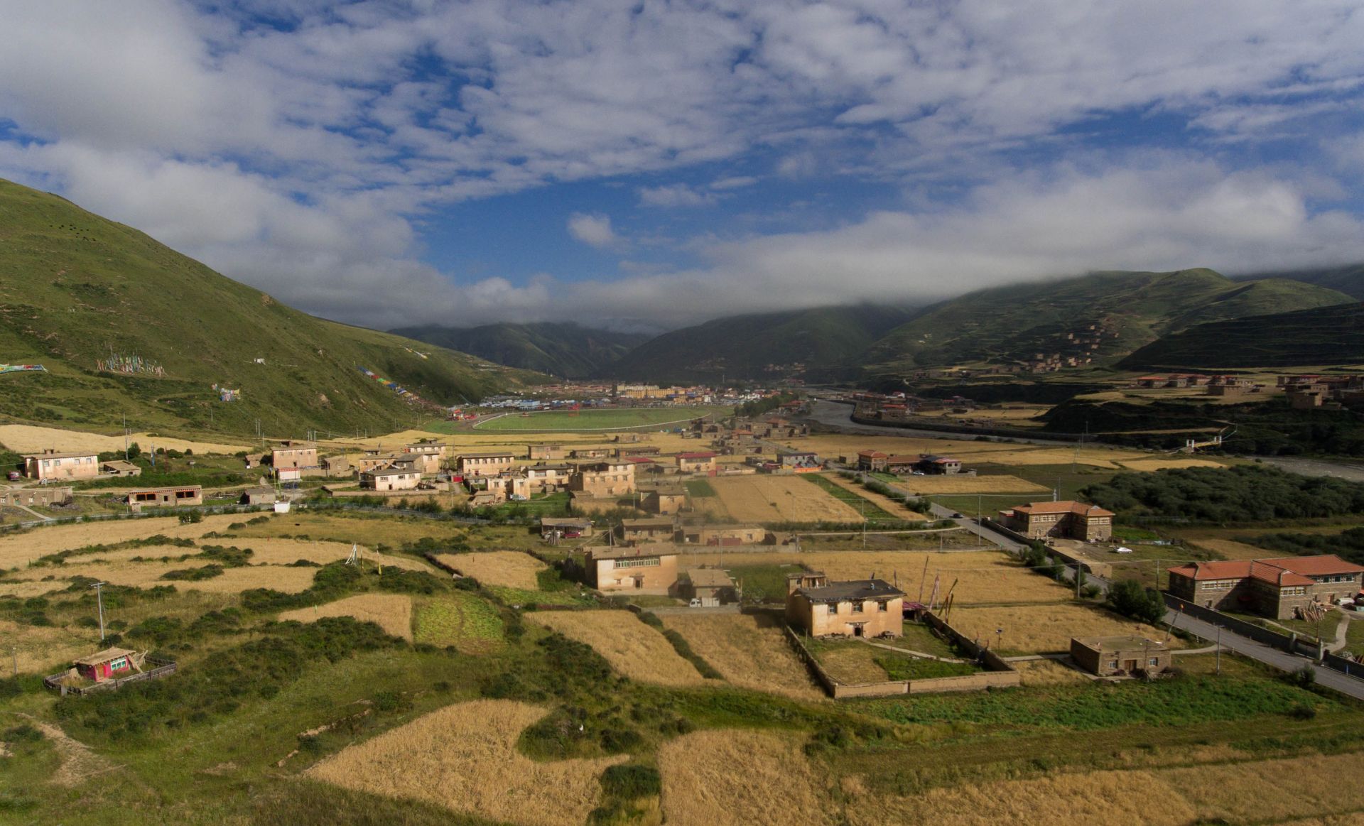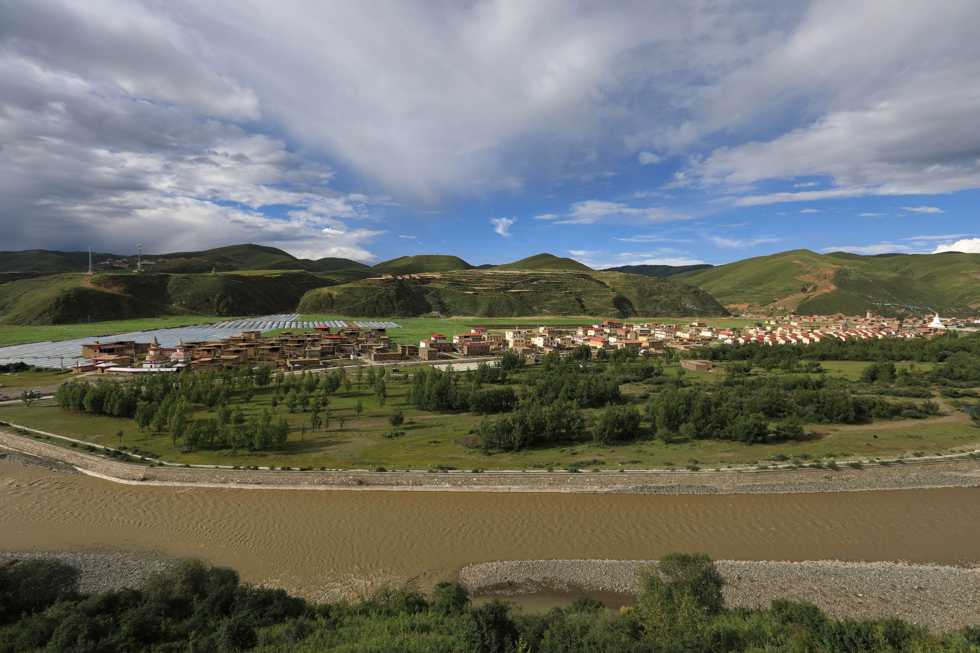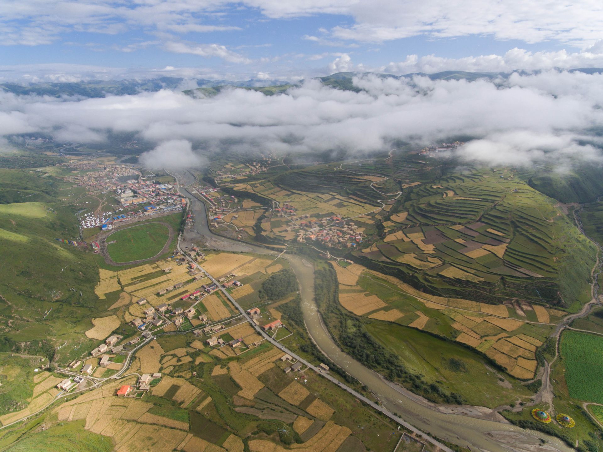 则曲河尕多乡热不卡村段(8月20日摄)。则曲河地处四川省壤塘县东北部,是大渡河支流之一,水域面积38.27平方公里。夏日的则曲河河谷,蓝天白云与田园村寨构成了一幅幅优美画卷。近年来,当地政府大力推进则曲河疏浚整治和流域生态治理工程,有效保护了流域生态环境,依托河谷两岸众多景观和近百公里旅游环线公路发展生态旅游。新华社记者 江宏景 摄