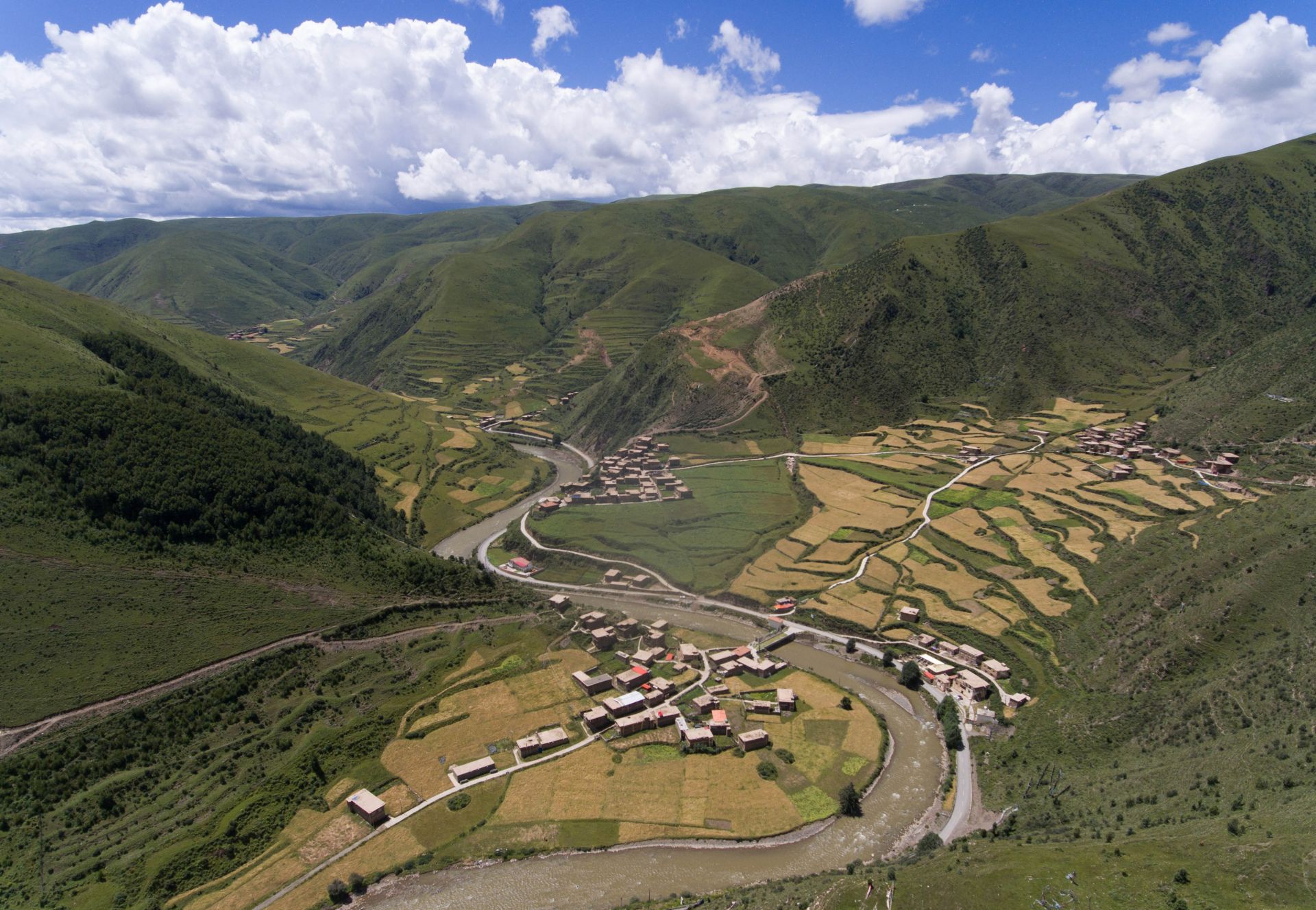 俯瞰则曲河茸木达乡啄昆村段(8月20日无人机拍摄)。新华社记者 江宏景 摄