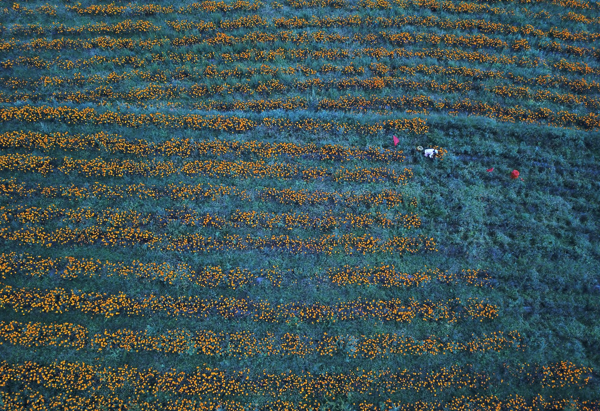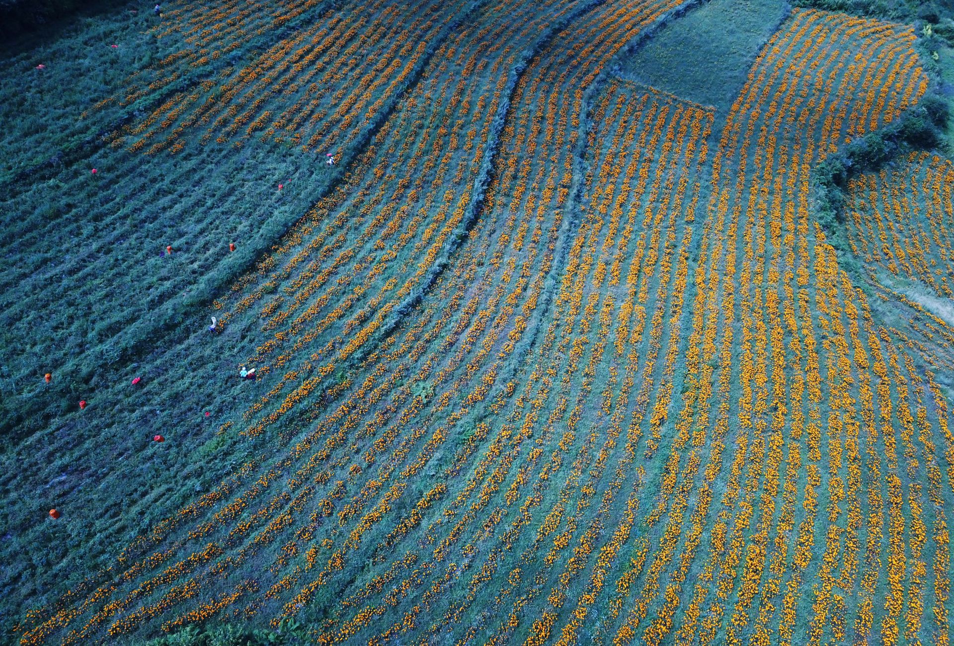 9月9日,村民在贵州省赫章县兴发乡中营村采摘万寿菊(无人机拍摄)。新华社发(杨文斌 摄)