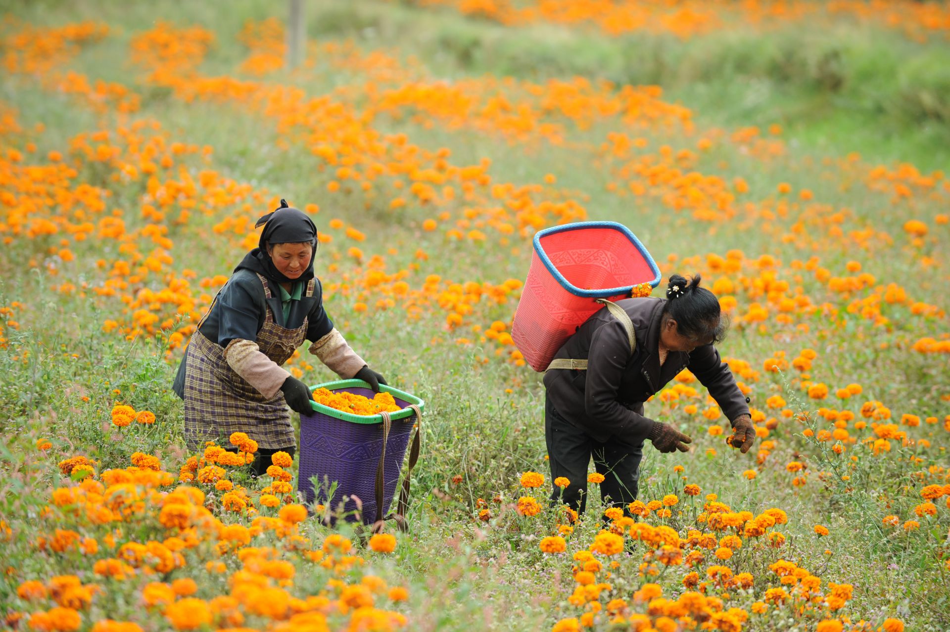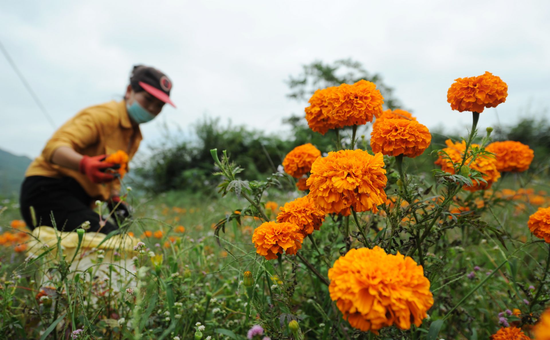 9月9日,村民在贵州省赫章县兴发乡中营村采摘万寿菊。 近日,贵州省赫章县兴发乡的村民忙着采摘万寿菊,供应市场。2018年,位于乌蒙山区的赫章县在部分乡村种植万寿菊1万余亩,既美化村庄,又获得经济收益,让“农旅结合”模式促进农民增收,助力乡村振兴。新华社发(杨文斌 摄)
