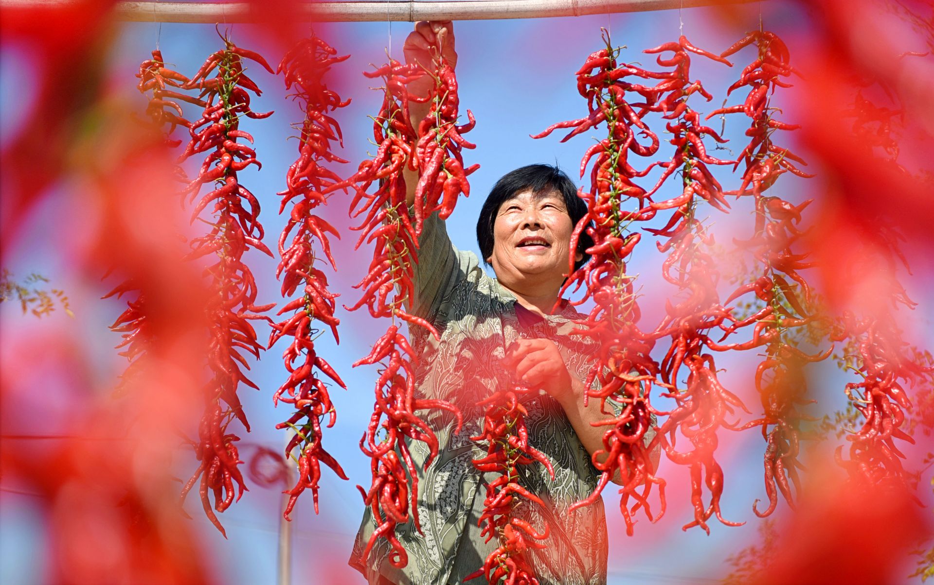9月11日,山东省淄博市沂源县东里镇东村的农民在晾晒辣椒。新华社 发(赵东山 摄)