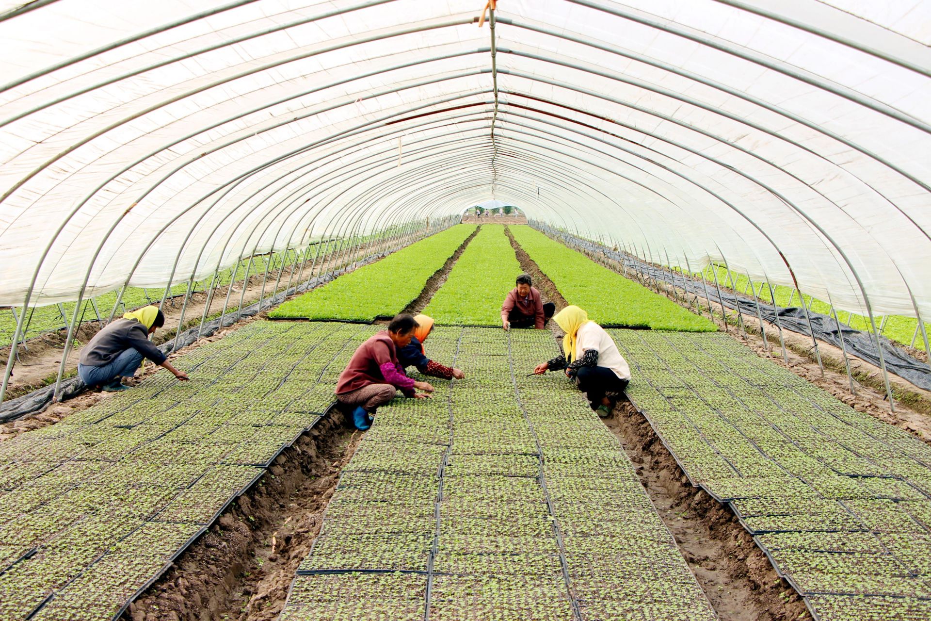 9月11日,在江苏省扬州市一蔬菜种植基地,农民在大棚里对白菜苗进行管理。新华社 发(沈冬兵 摄)