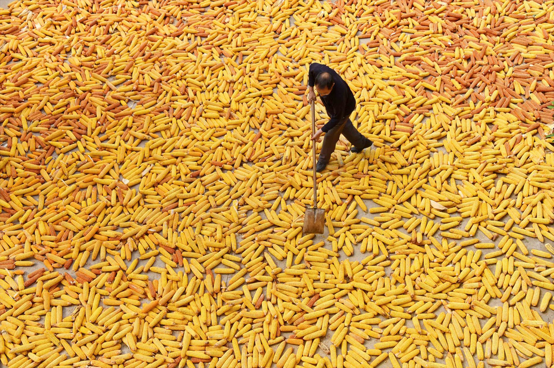 9月10日,山东省淄博市沂源县鲁村镇西坡村的农民在晾晒玉米。新华社 发(赵东山 摄)