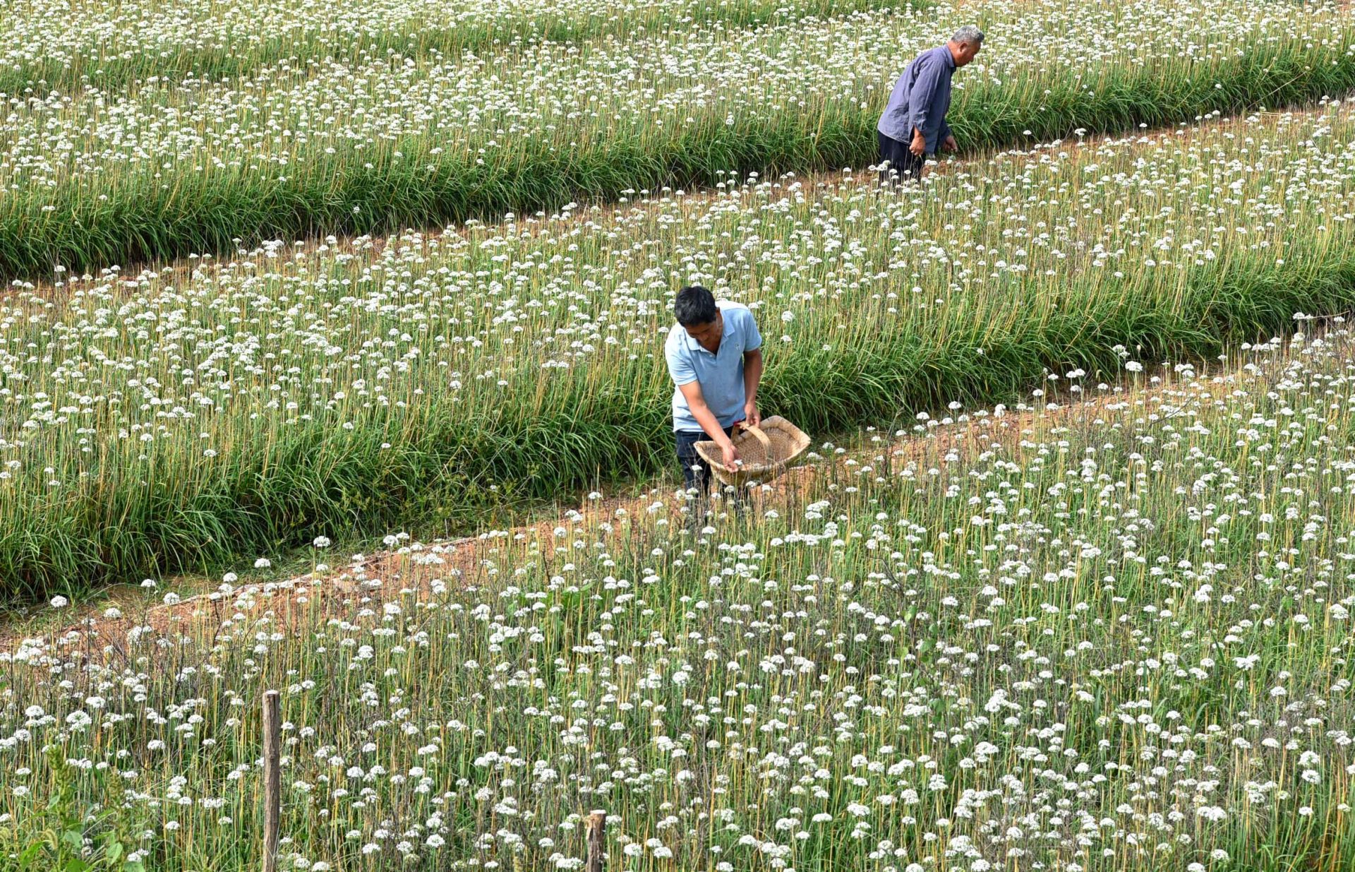 9月10日,山东省淄博市沂源县鲁村镇鲁村四村的农民在采摘韭菜花。新华社 发(赵东山 摄)