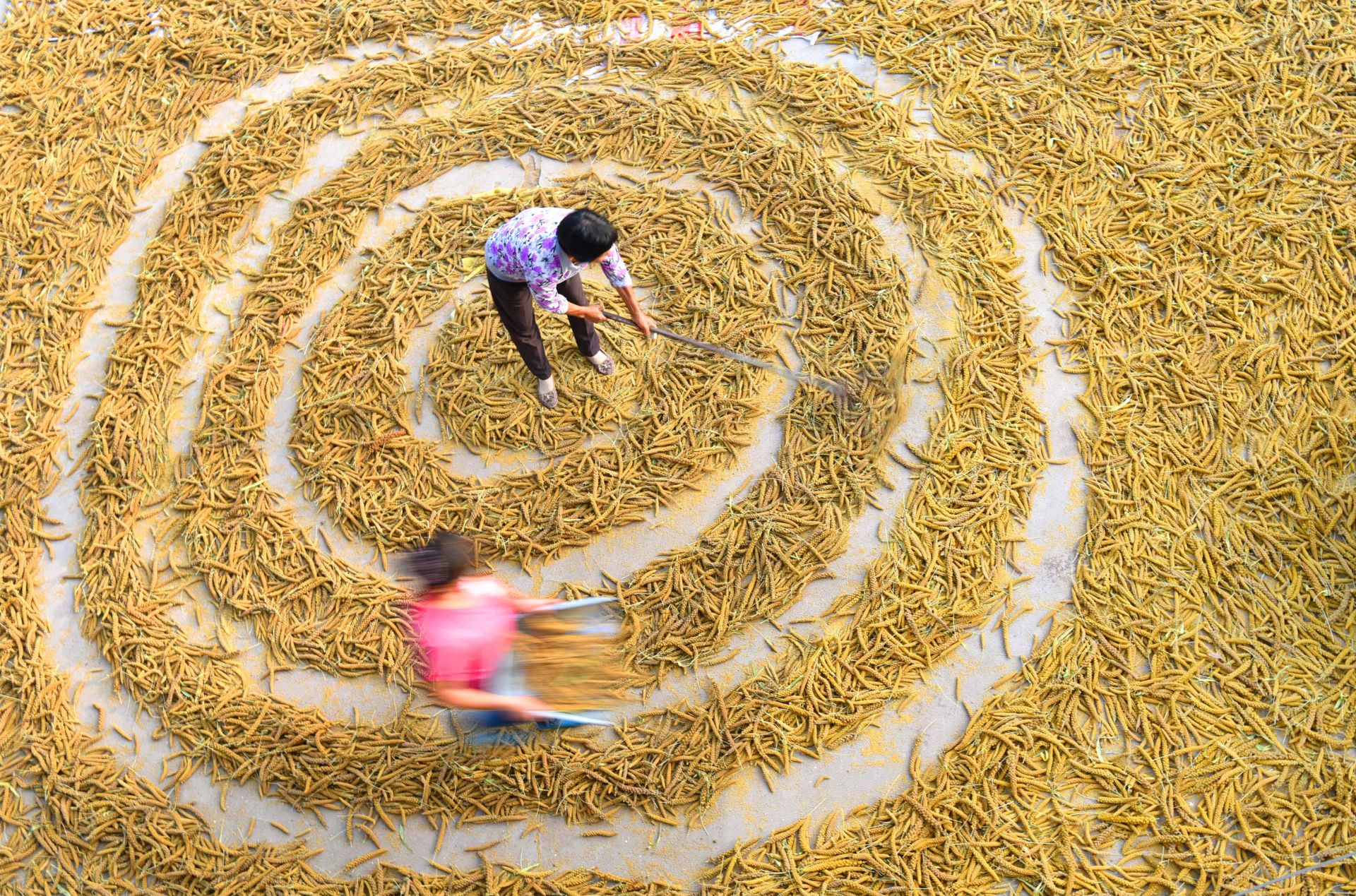 9月10日,山东省淄博市沂源县悦庄镇东悦庄村的农民在晾晒谷子。新华社 发(赵东山 摄)