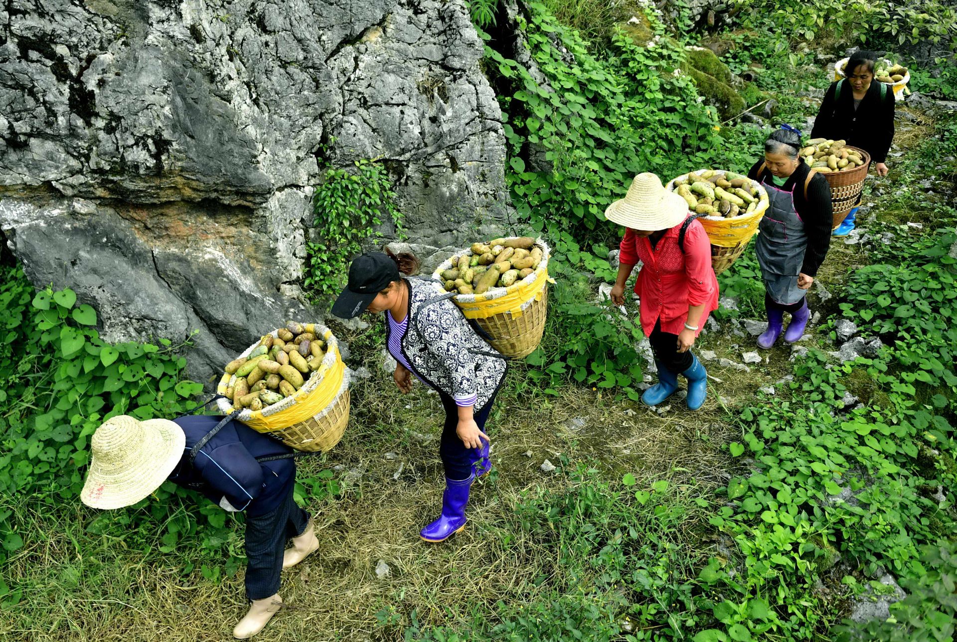 9月11日,湖北省恩施土家族苗族自治州宣恩县硒源八月瓜产销合作社的社员采瓜归来。新华社 发(宋文 摄)